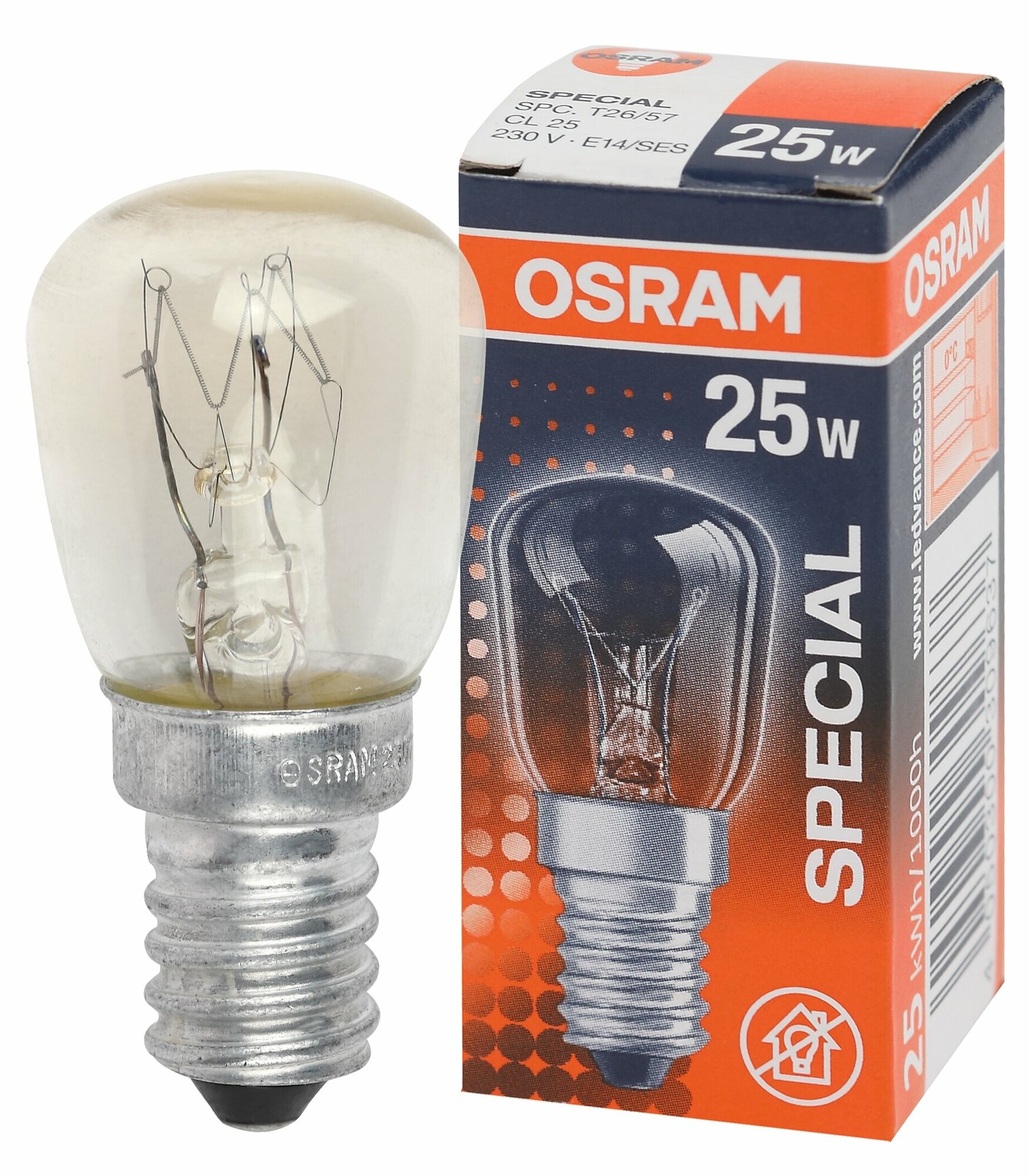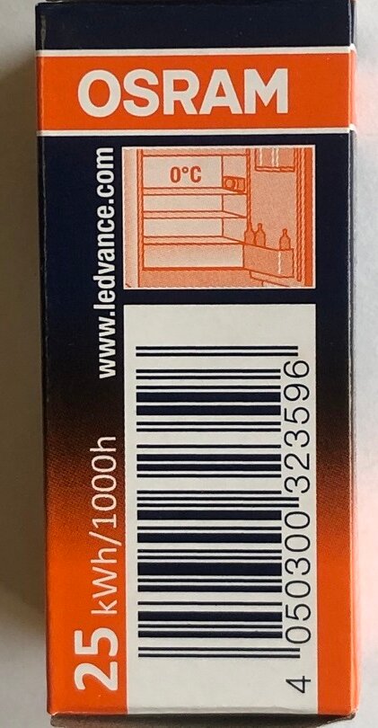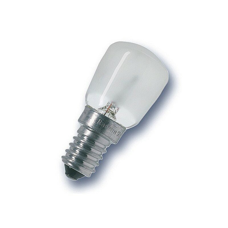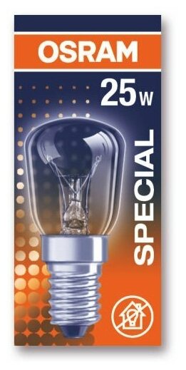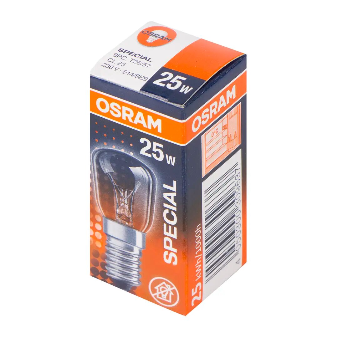 Лампа накаливания Osram для холодильника поможет разглядеть продукты на полках даже ночью. Она работает в сети 220 вольт, потребляет мощность 25 Вт и светит теплым белым светом. У нее прозрачная колба и цоколь E14. Е14 — «младший брат» стандартного цоколя E27. Отличие только в диаметре: 14 мм вместо 27 мм. Цоколь подходит для миниатюрных ламп типа «миньон», используемых в небольших светильниках. Цоколь типа E (он же «винт Эдисона») повсеместно применяется для ламп бытовой электросети как в России, так и в Европе. Благодаря резьбовому соединению он быстро вкручивается в патрон, как большой винт.