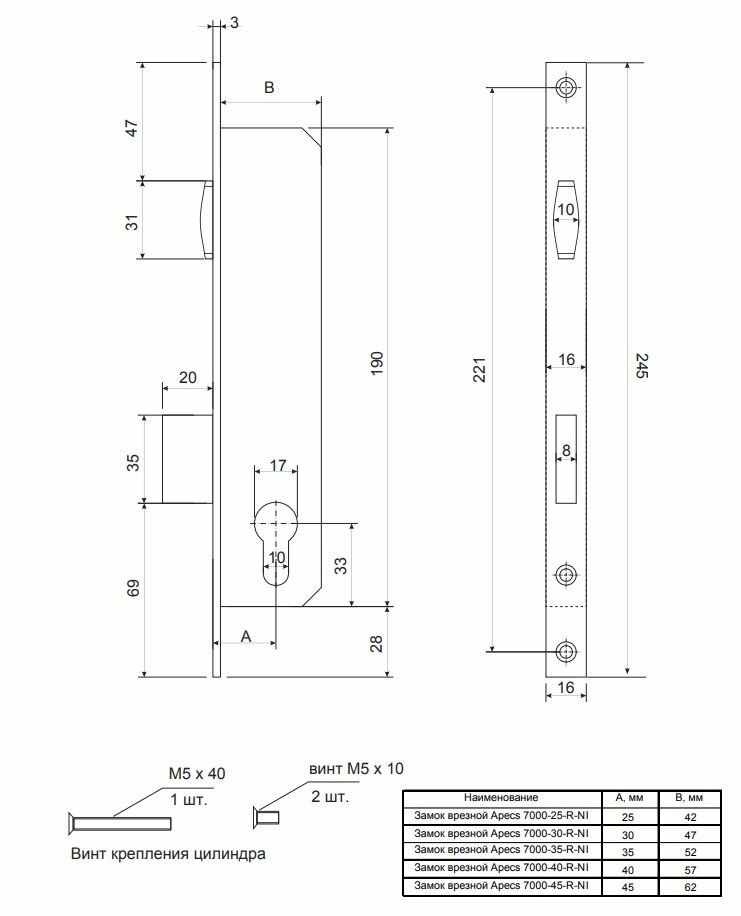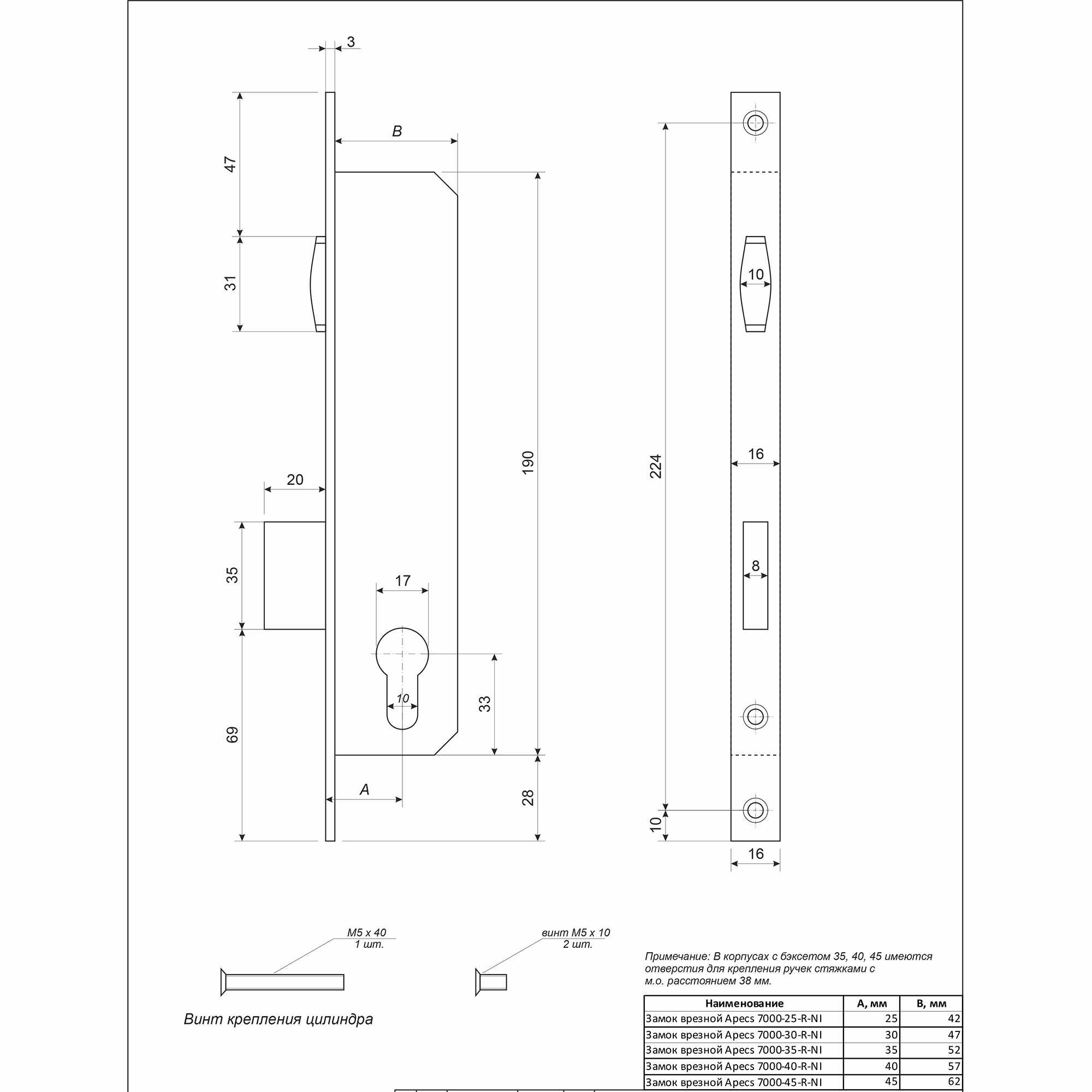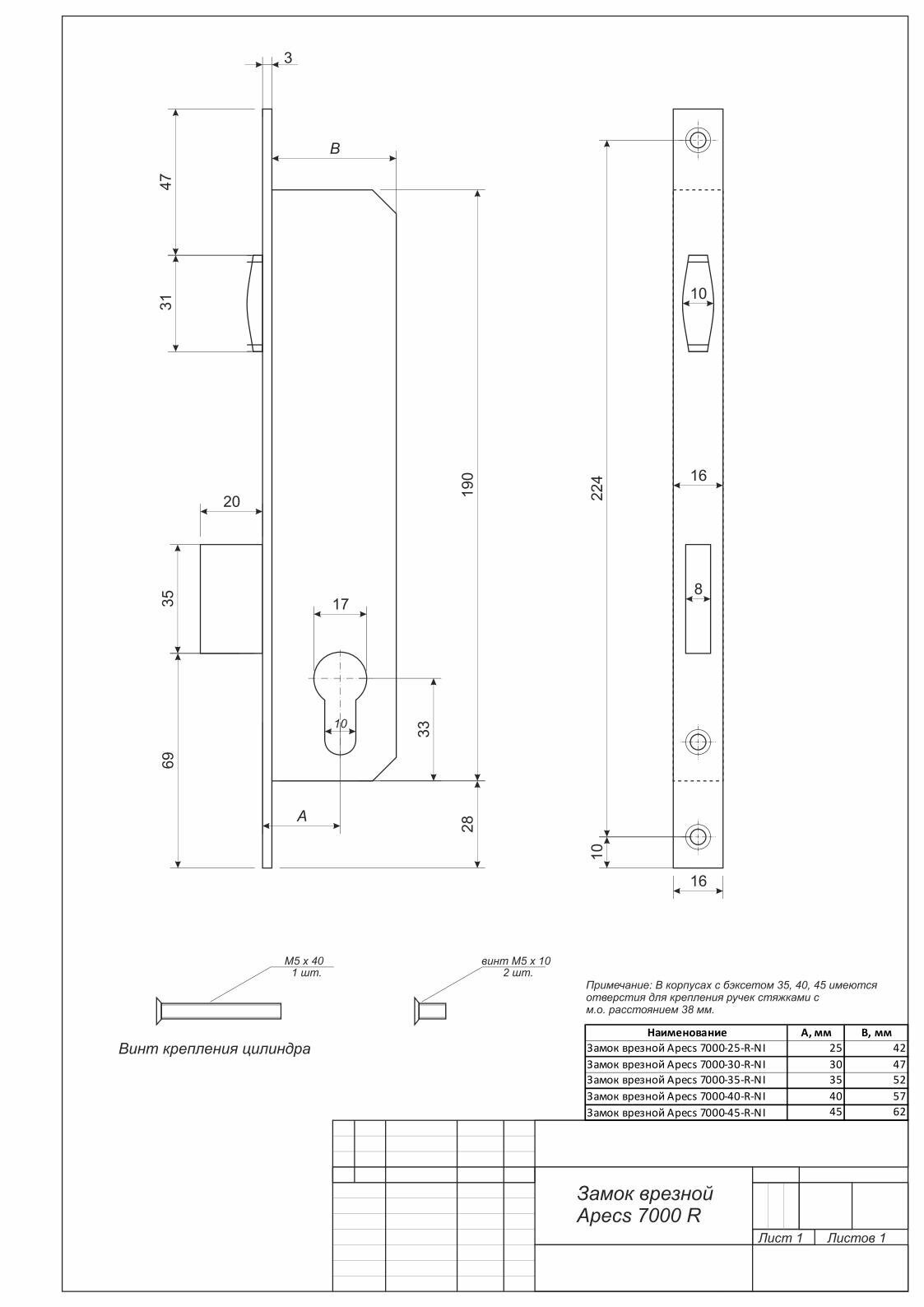 Замок врезной Apecs 7000-35-R-NI цвет никель