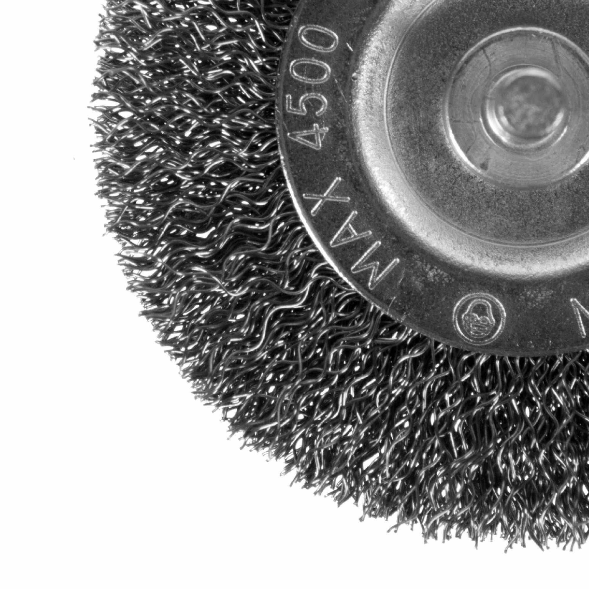 Щетка для дрели дисковая Dexter — точильная насадка для чистки металлических поверхностей в узких местах: снятия сварных наплывов, удаления краски, ржавчины, окалины. Рабочая часть представляет собой щетину из металлической проволоки толщиной 1 мм. Для надежной фиксации в патроне предусмотрен цилиндрический стержень диаметром 6 мм. Страна производства — Китай.