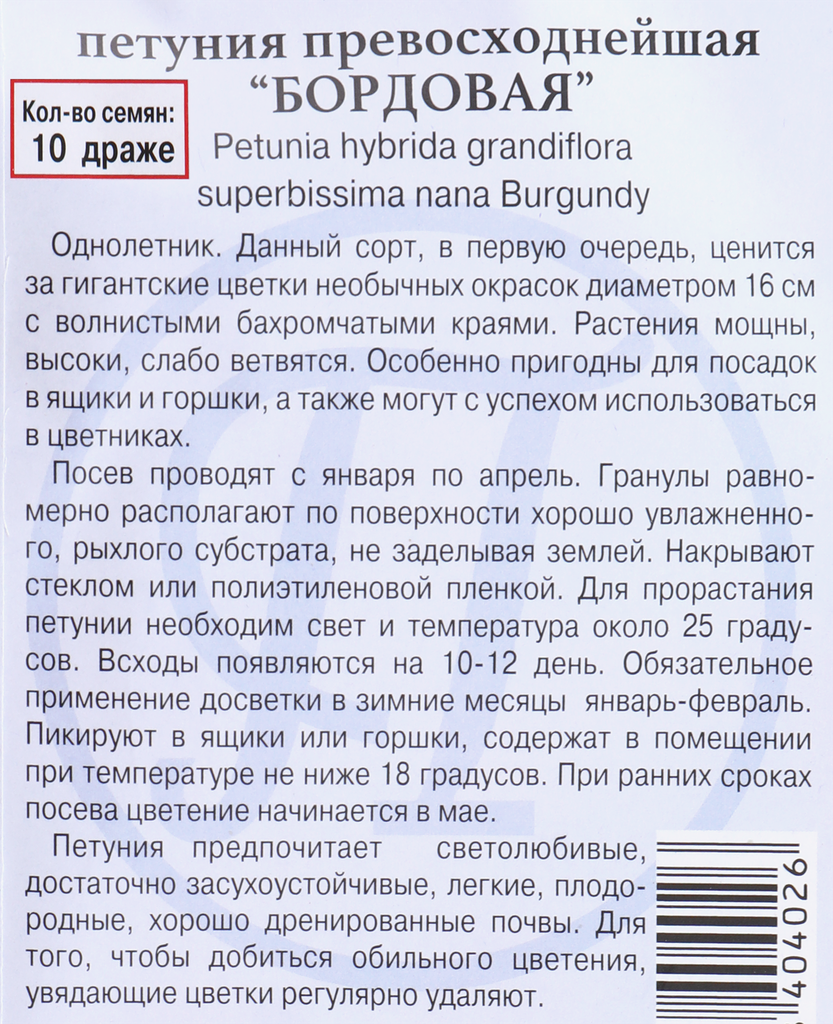 | Сорт | ПЕТУНИЯ ПРЕВОСХОДНЕЙШАЯ "БОРДОВАЯ" |