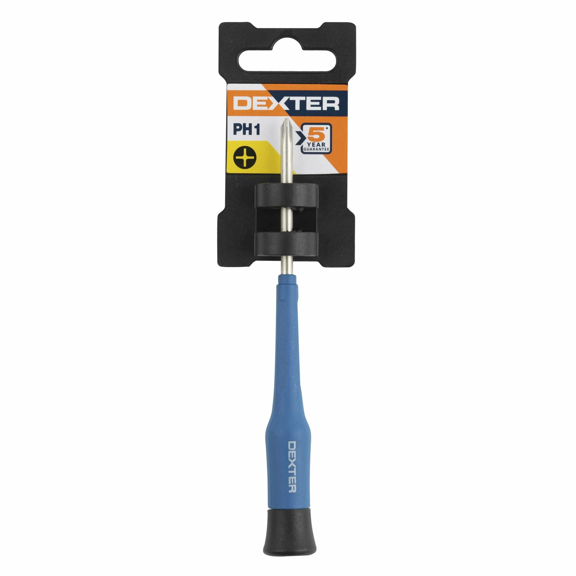 Отвертка крестовая прецизионная Dexter ― ручной инструмент, предназначенный для точного завинчивания мелких крепежных деталей с головками типа PH1. Имеет вид металлического жала длиной 50 мм, оформленного удобной рукояткой. Модель используется при ремонте бытовой техники, электроники, оптики, ювелирных изделий и других предметов обихода.