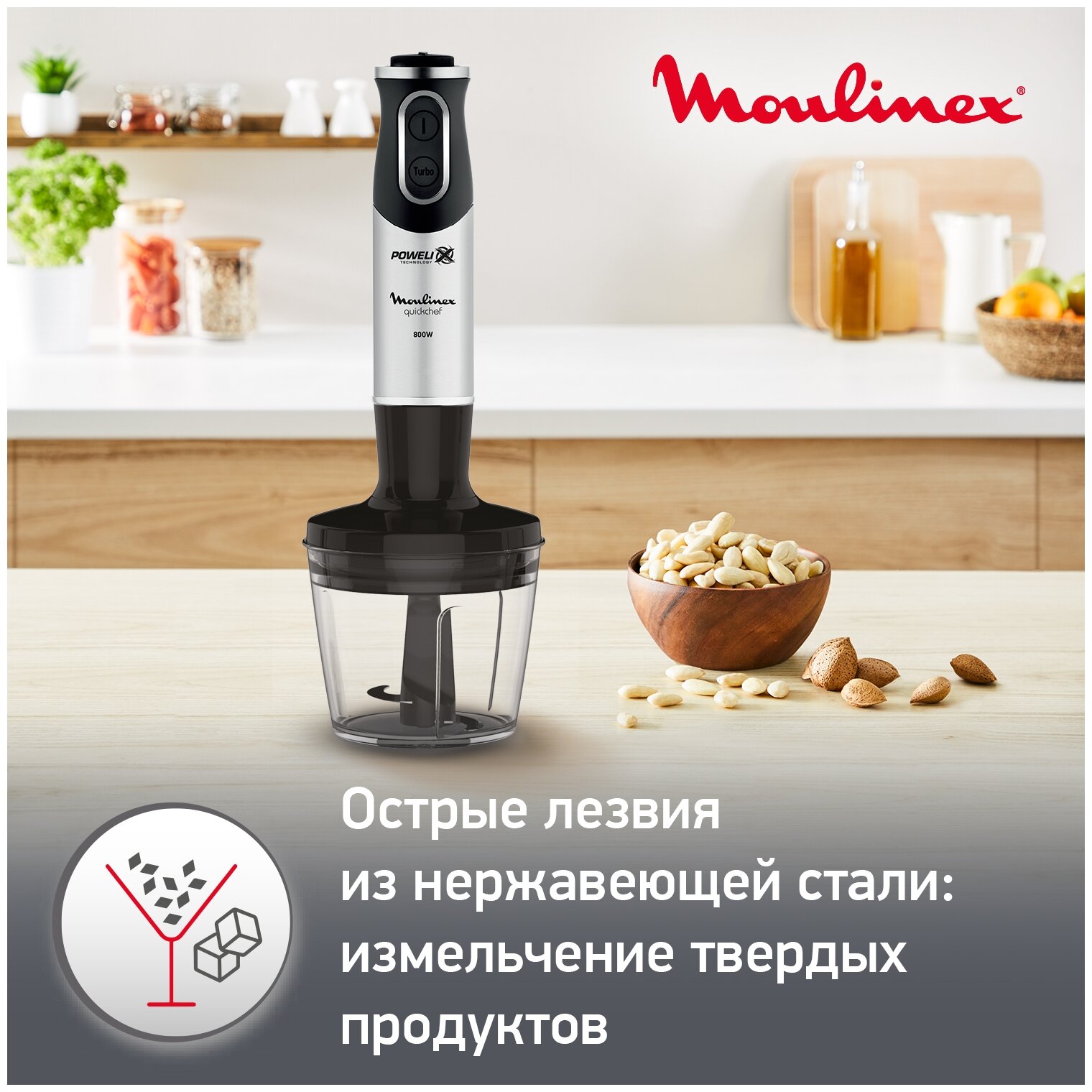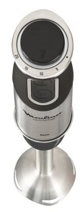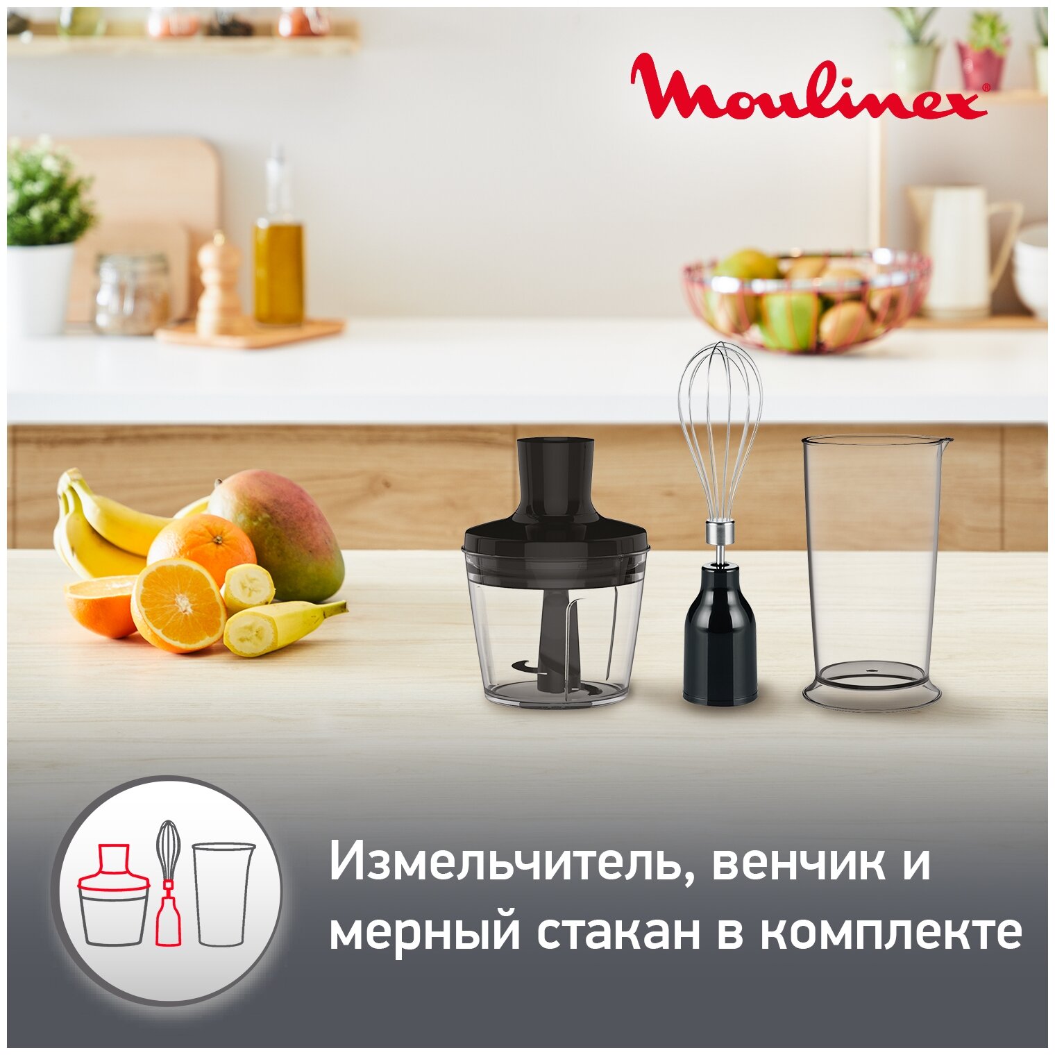 Moulinex – современный погружной блендер, предназначенный для измельчения и смешивания продуктов. Он работает быстро и эффективно. Блендер оснащён удобной прорезиненной ручкой, которая не скользит в ладони. 20 скоростных режимов. К блендеру прилагаются насадка для измельчения и смешивания, форма которой обеспечивает отсутствие брызг при использовании, а также мини-измельчитель, объём которого составляет 500 мл, и металлический венчик для взбивания.