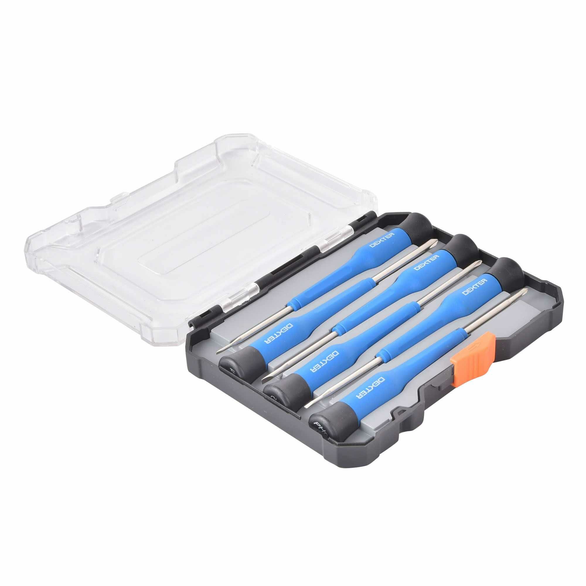 Набор прецизионных отверток Dexter состоит из 6 предметов. Предназначен для высокоточных работ по ремонту и обслуживанию сложной техники. Набор включает 6 прецизионных отверток типов SL и PH с ручками эргономичной формы из высококачественного пластика. Рабочая часть инструмента изготовлена из прочного и износостойкого хромованадиевого сплава. Общий вес набора составляет 214 г. Изготавливается в Китае.