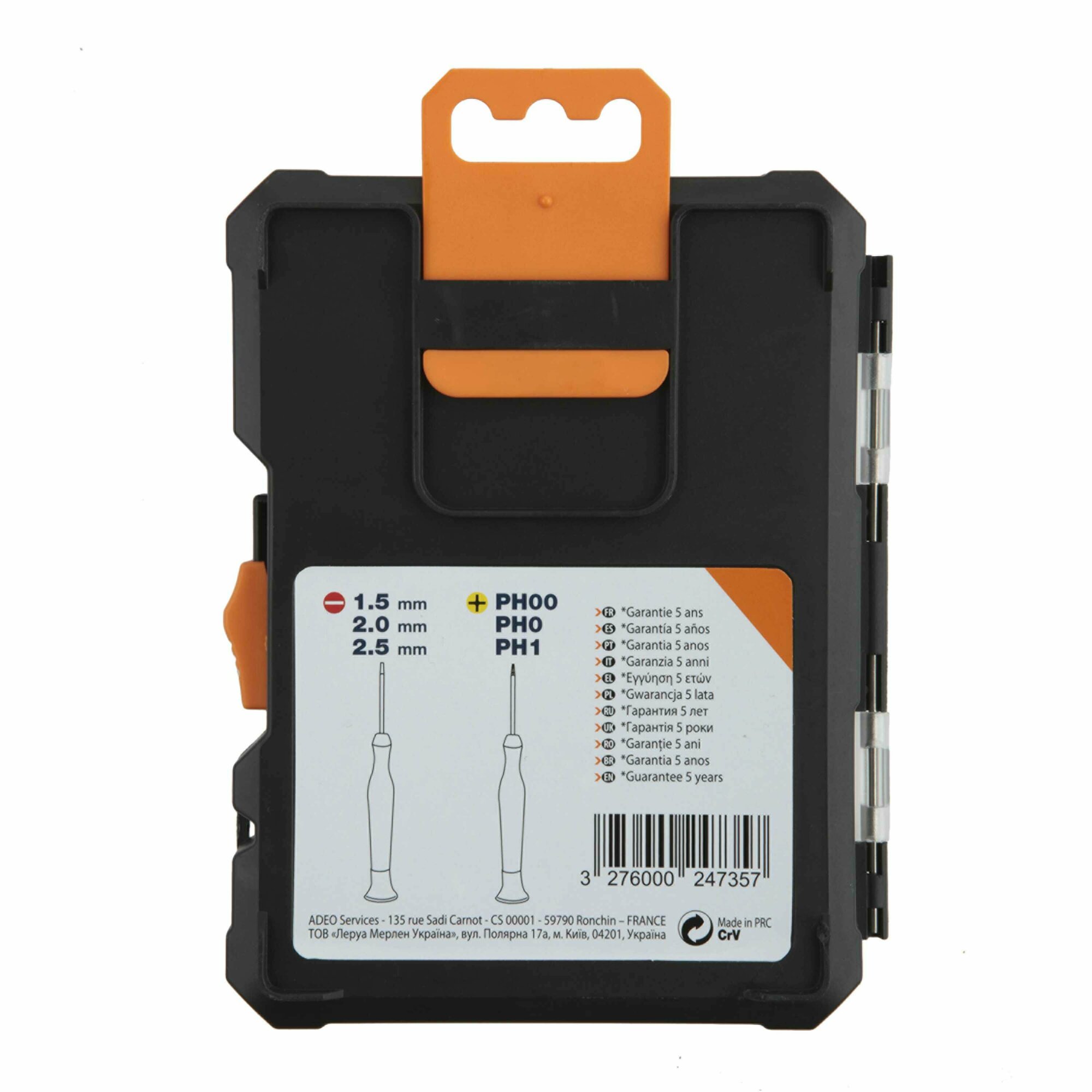 | Состав комплекта | Набор отверток: SL1.5, SL2, SL2.5, PH00, PH0, PH1 |