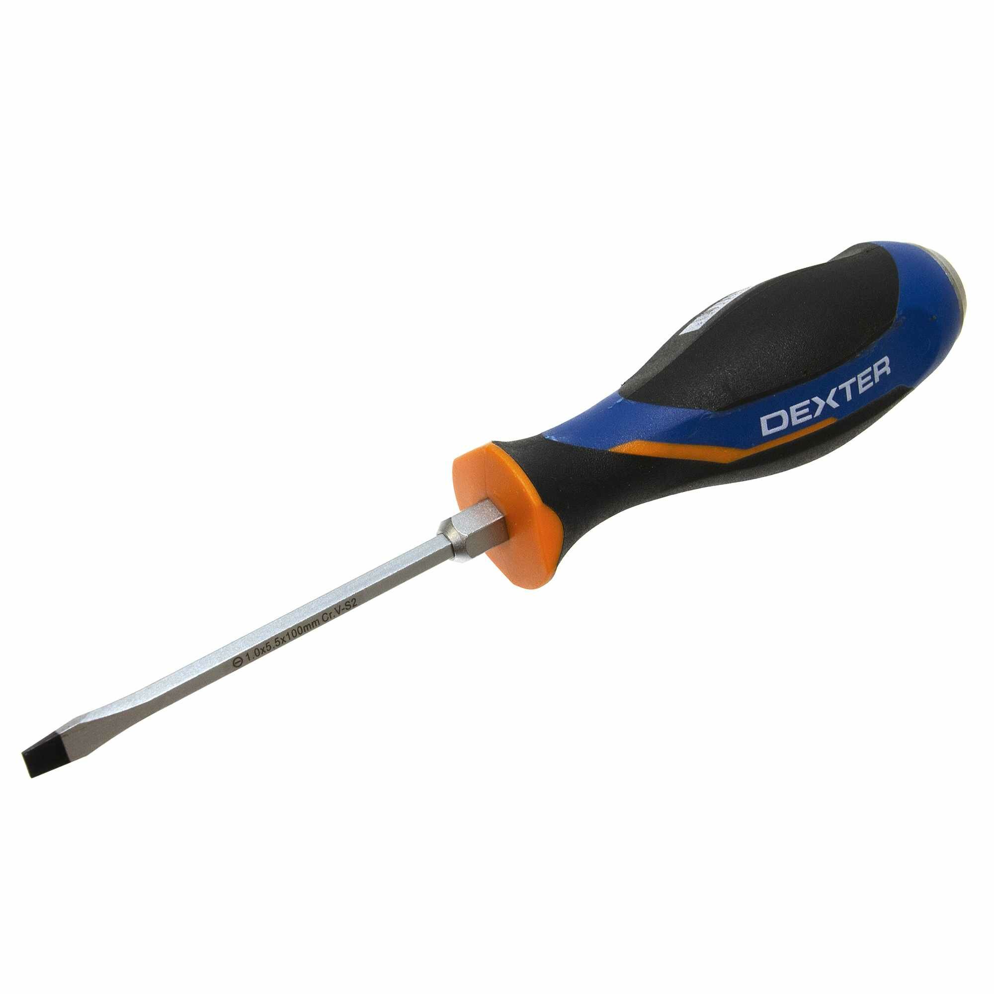 Отвертка шлицевая ударная Dexter ― ручной слесарный инструмент, применяемый для подключения электричества и мелкого ремонта. Подходит для демонтажа застарелых и заржавевших винтов, болтов и саморезов. Главная особенность ударной отвертки заключается в монолитном сердечнике, который на одном конце выполнен в виде жала с наконечником типа SL5.5, на другом ― в виде массивной пятки. У основания жала сердечник выполнен в форме шестигранника, который позволяет придать отвертке крутящий момент при помощи ключа после удара молотком.