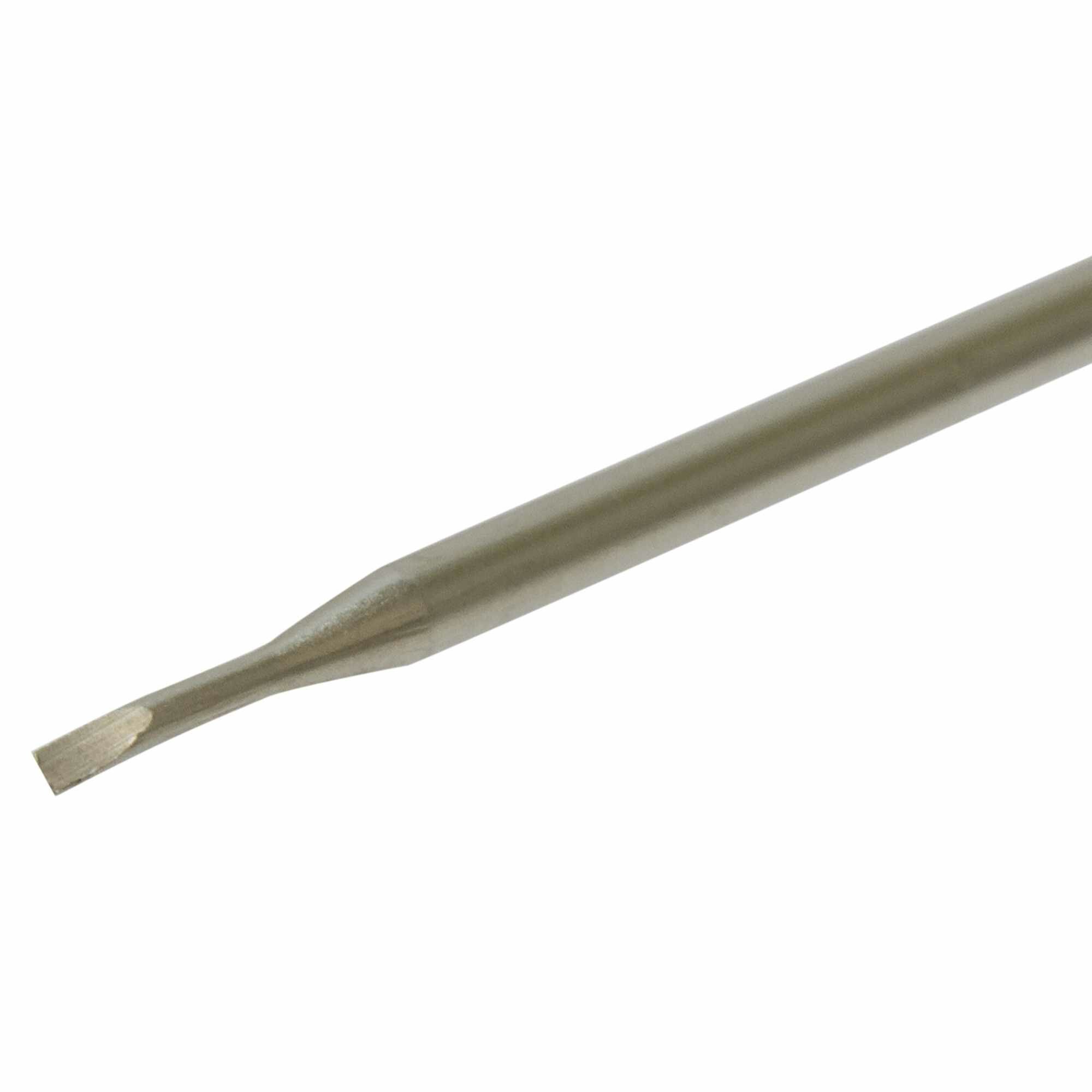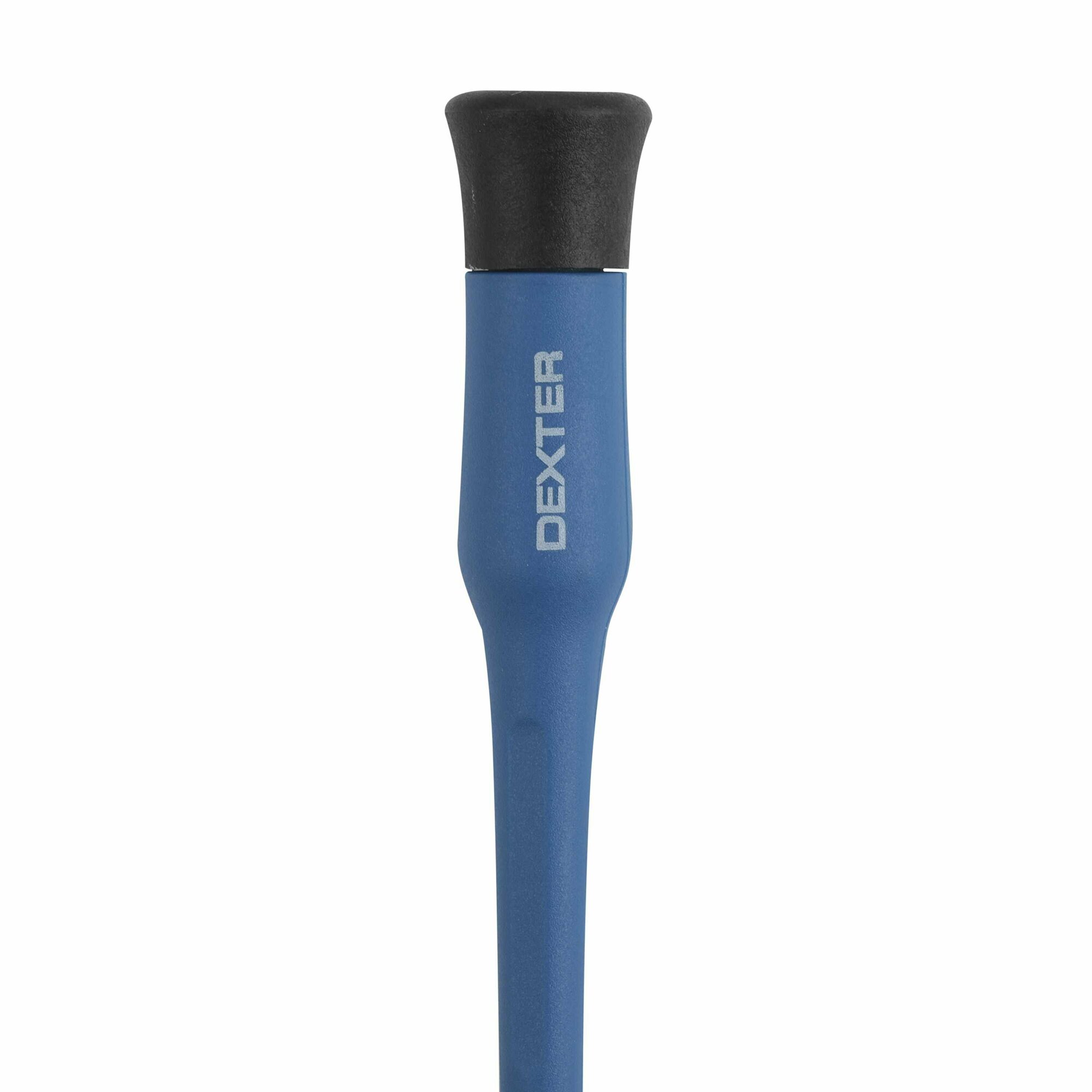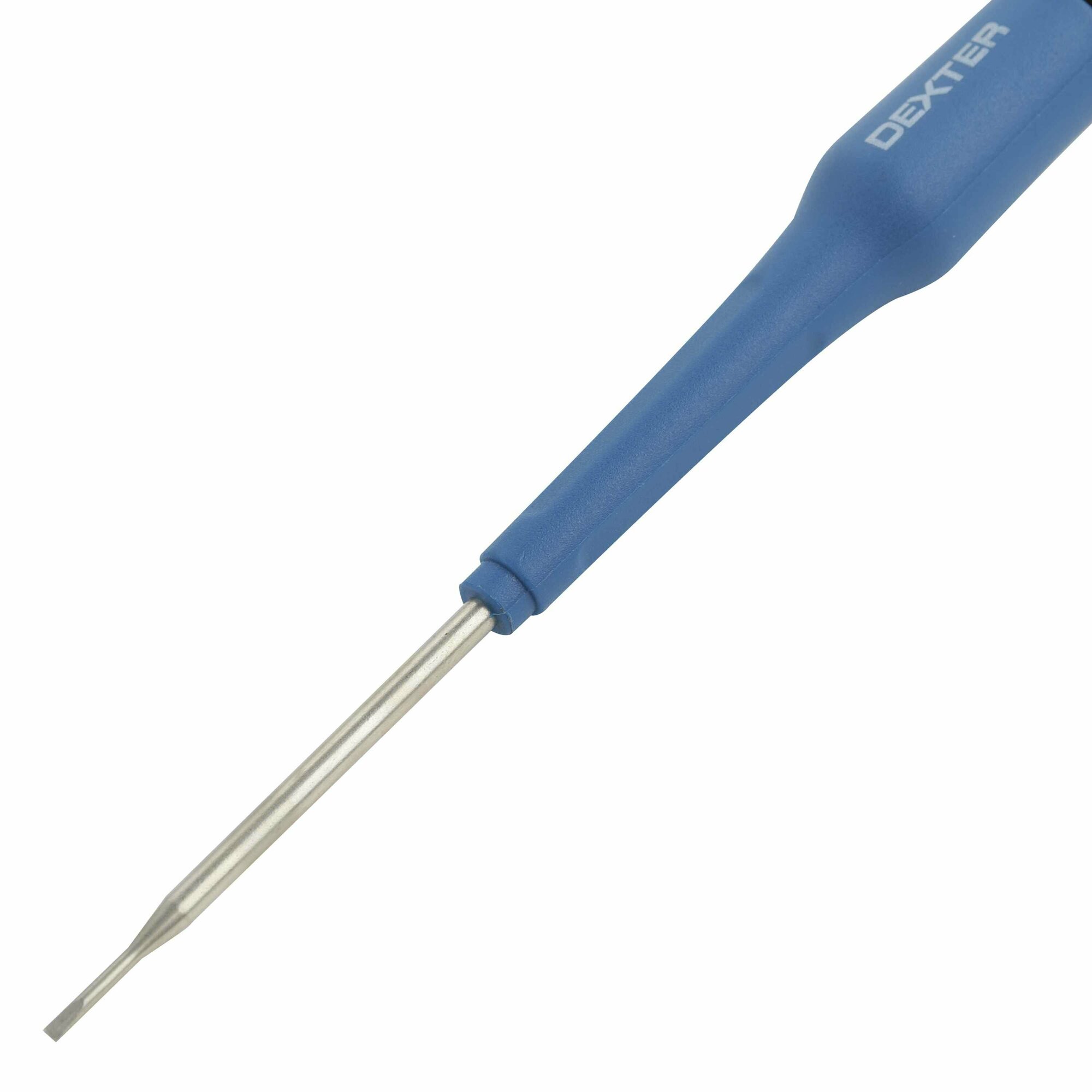 Отвертка шлицевая с узким жалом Dexter ― ручной механический инструмент, используемый для точного завинчивания малых крепежных элементов с резьбой. Применяется при ремонте мелкой электротехники и электроники, ювелирной продукции, оптики и пр. Представляет собой высокопрочное металлическое жало с наконечником типа SL1.5, оформленное эргономичной рукояткой.