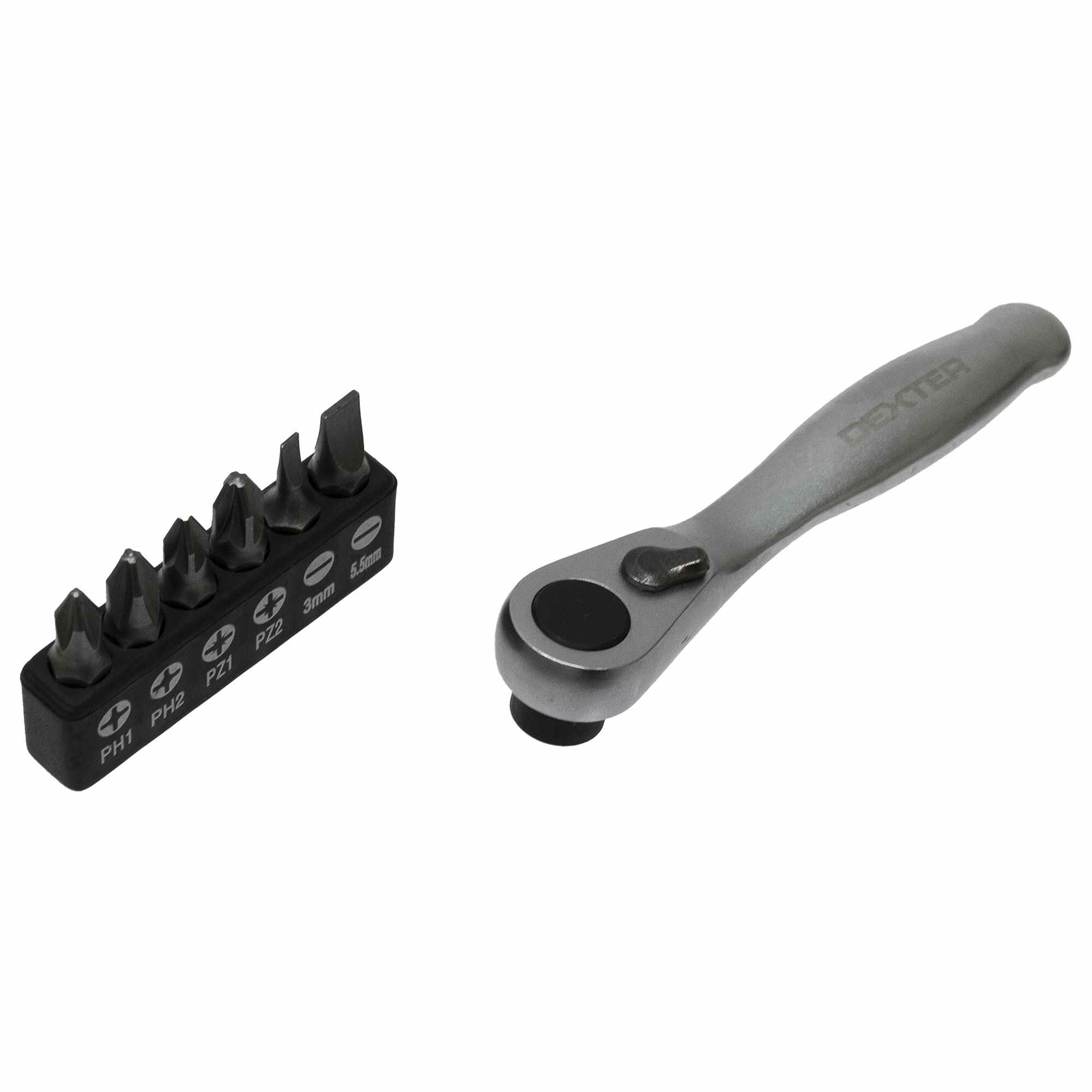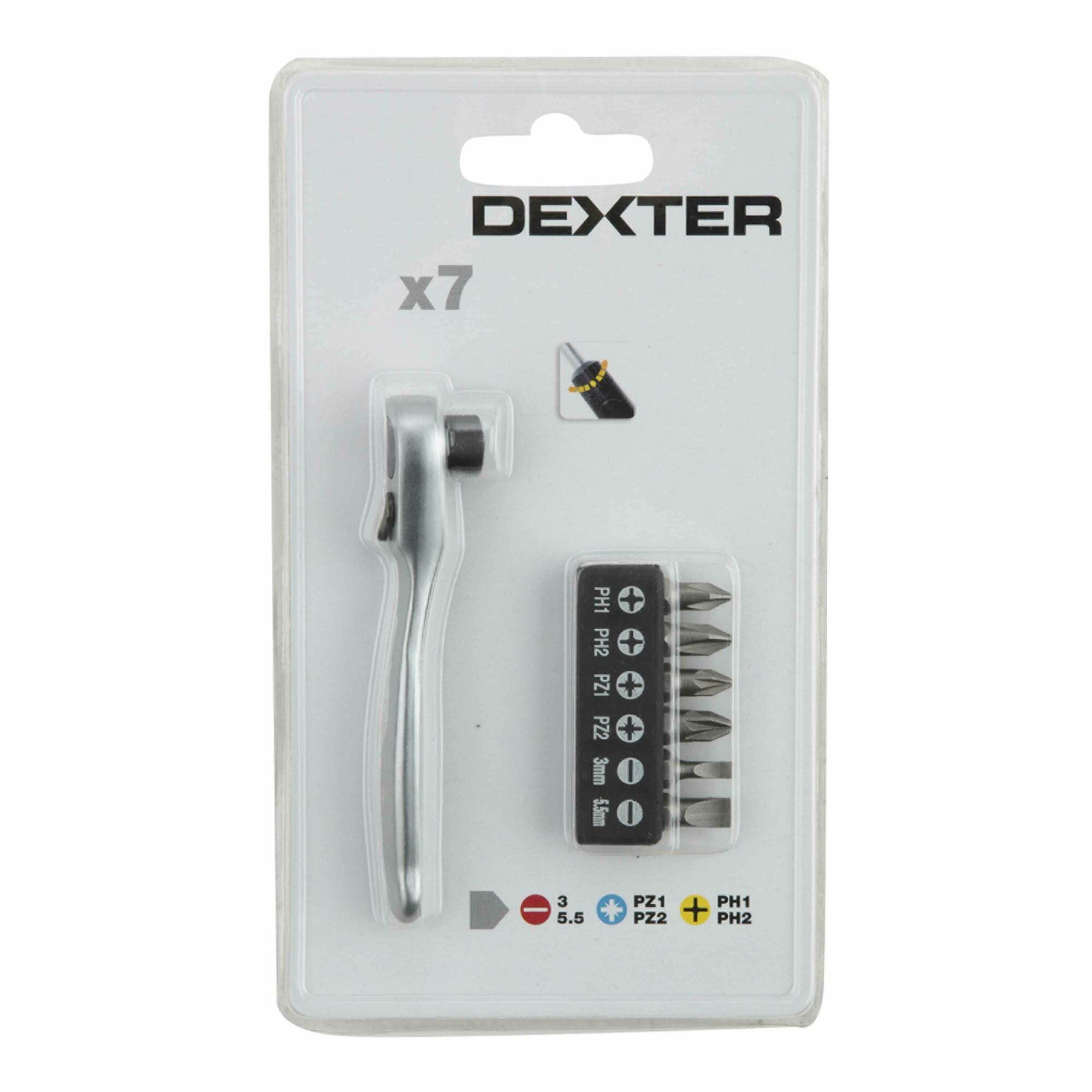 Отвёртка со сменными насадками Dexter с трещоткой используется при работе с различными видами крепежных деталей. Состоит из пластиковой ручки с флажковым переключателем направления работы храпового механизма и шести сменных насадок, изготовленных из хромованадиевого сплава. Общий вес набора составляет 101 г. Страна производства инструмента — Китай.