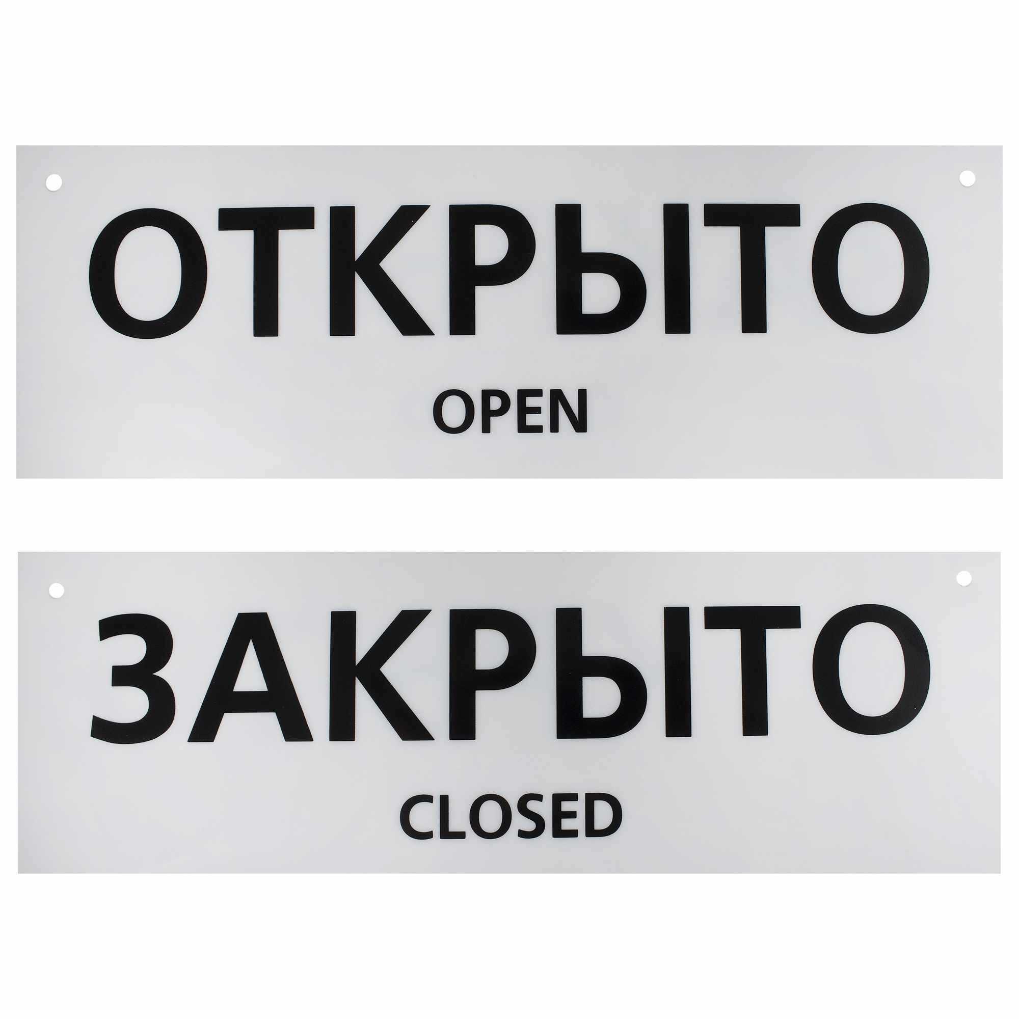 Табличка «Открыто/Закрыто» — двусторонний информационный знак, оповещающий о режиме работы заведения. Изделие выполнено из пластика, предусмотрены два отверстия для подвеса. Черные буквы на светлом фоне хорошо заметны издалека. Надписи продублированы на английском языке. Чтобы открыть или закрыть учреждение для посетителей, нужно лишь развернуть табличку нужной стороной к улице.