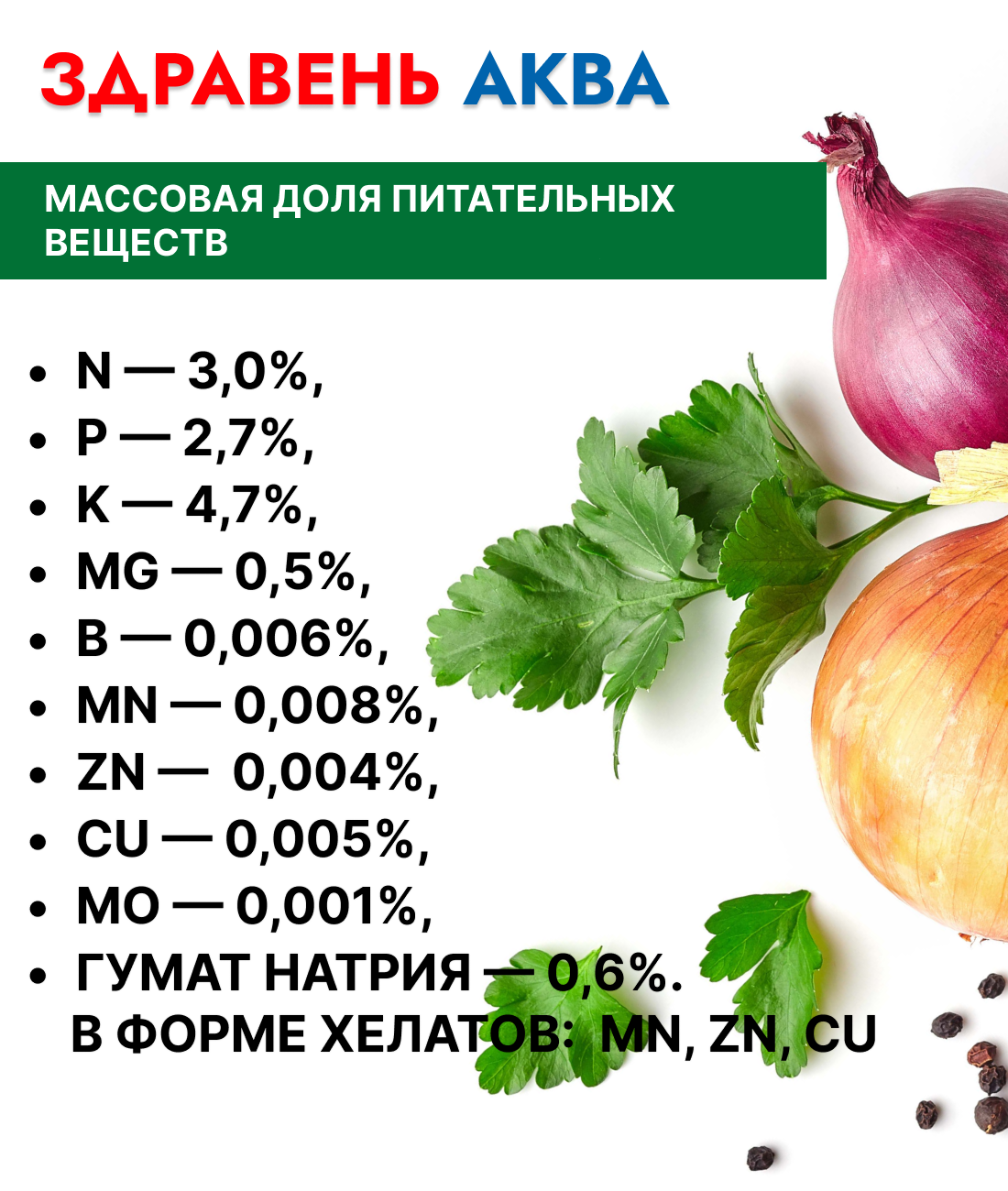 Удобрение «Здравень Аква» для лука и чеснока содержит набор микро- и макроэлементов, необходимых для роста и развития растений. Стимулирует формирование луковиц большого размера с хорошим вкусом.