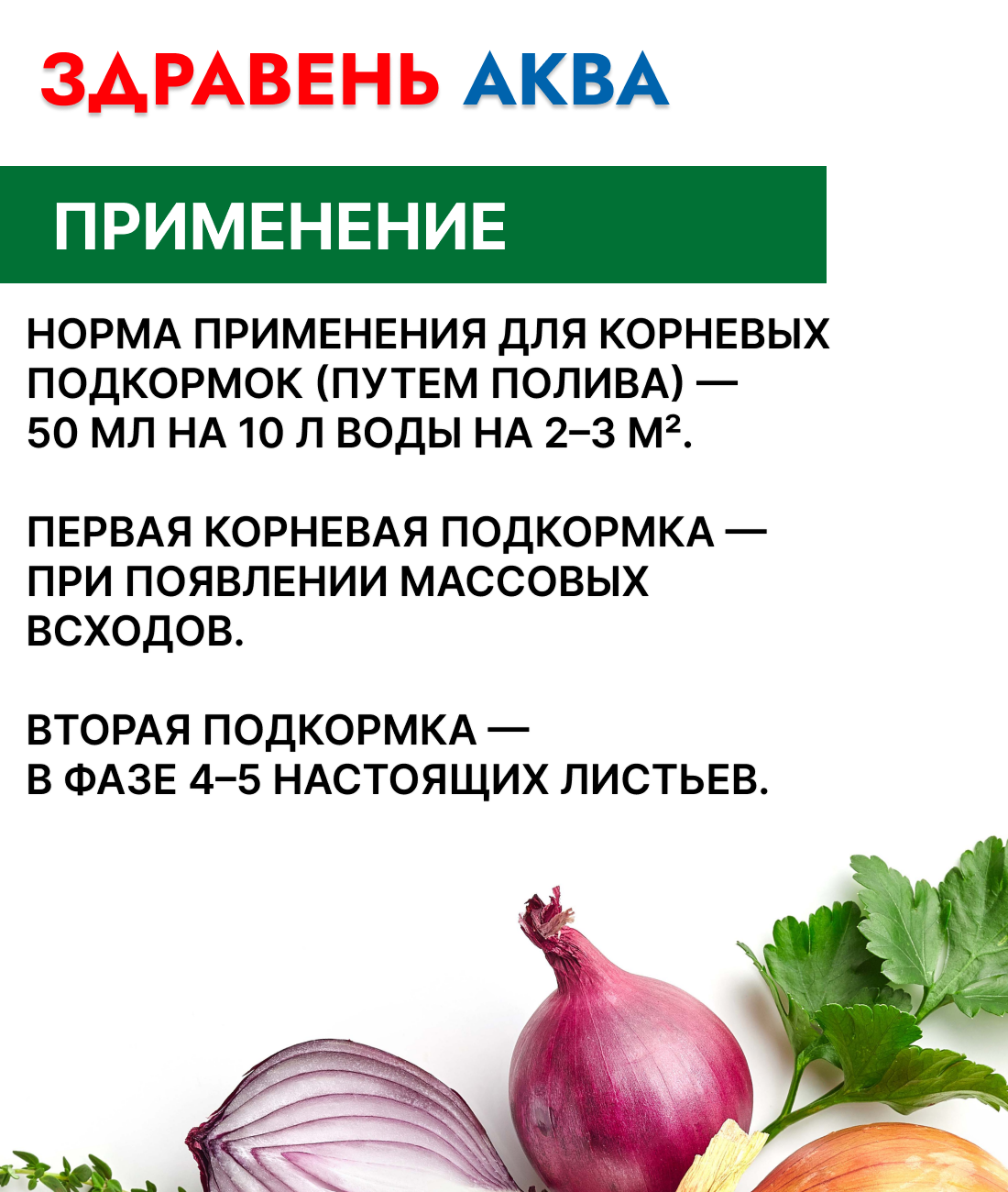 | Способ применения | норма применения для корневых подкормок (путем полива) — 50 мл на 10 литров воды на 2–3 м2. Первая корневая подкормка — при появлении массовых всходов. Вторая подкормка — в фазе 4–5 настоящих листьев. Третья подкормка — в период формирования луковиц. Для внекорневых подкормок — 3,5 мл на 1 литр воды. Внекорневые подкормки проводят путём опрыскивания листьев в промежутках между корневыми подкормками (через 7–10 дней) или вне зависимости от них. Допустимо проводить подкормку совместно с обработкой препаратами против вредителей и болезней (кроме бордоской смеси). |