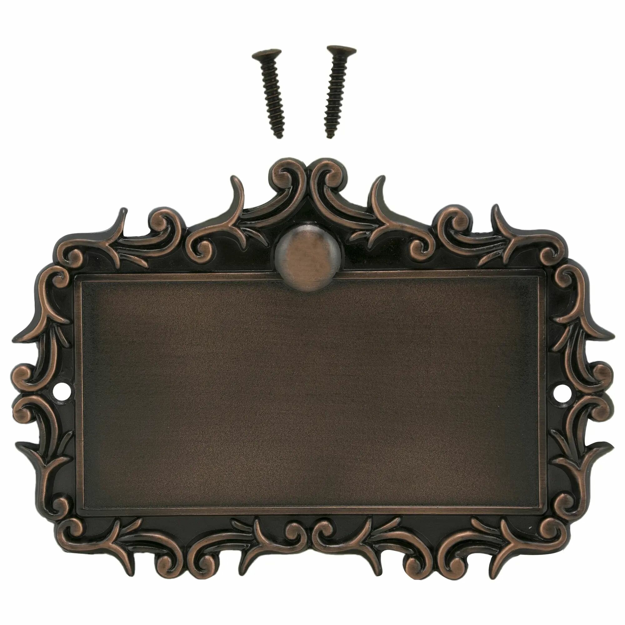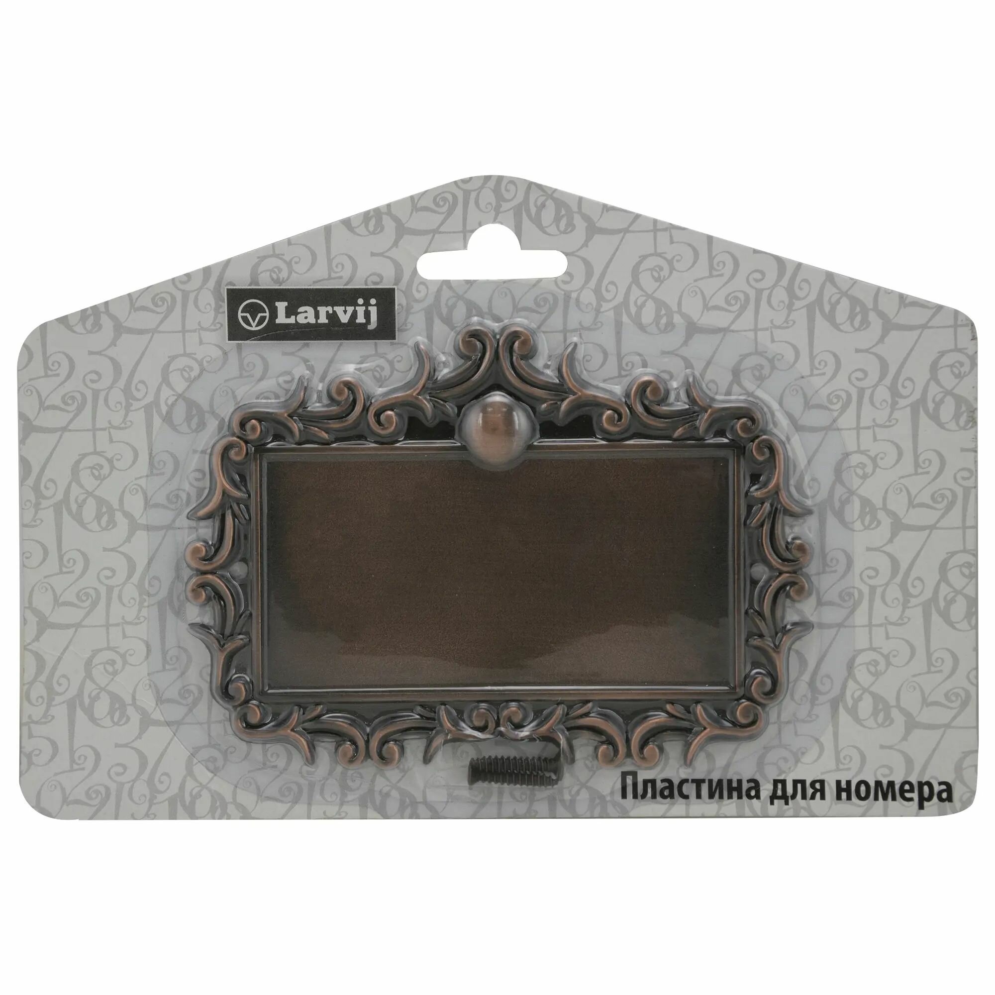 Пластина для номера Larvij — благородная табличка, которая будет хорошо смотреться на любой двери. Это солидное изделие прямоугольной формы, украшенное по периметру орнаментом. Цвет — темно-коричневый. На таком основании можно разместить до трех цифр этого производителя. Для установки пластины необходимо подготовить два отверстия. Табличка крепится к двери саморезами.