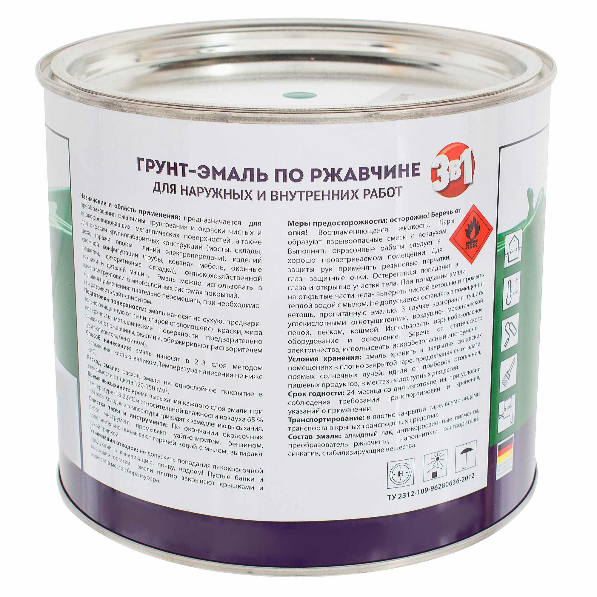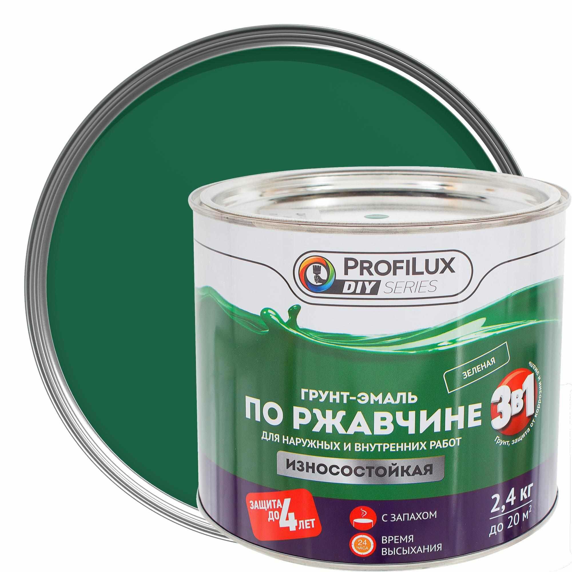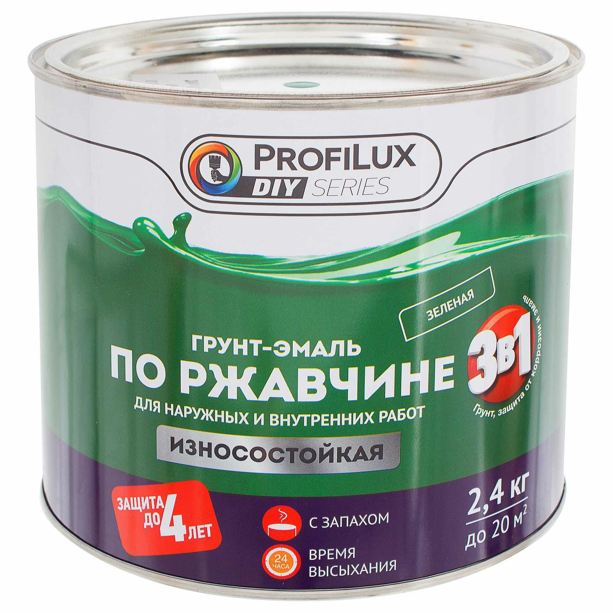 Грунт-эмаль по ржавчине «3 в 1» износостойкая ProfiLux (зеленый цвет) — комплексный лакокрасочный состав, выполняющий функции грунтовки, преобразователя ржавчины и финишной отделки. Надежно защищает поверхность металла от коррозии (не менее 4 лет). При необходимости используется в качестве грунта в многослойных покрытиях. Одной банкой состава при однослойном нанесении можно покрыть площадь до 20 м^2^. Страна производства — Россия.