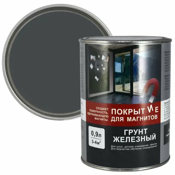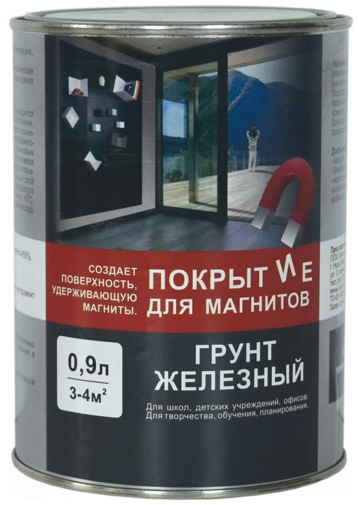 Грунт железный ВДАК-0111 (Россия) после высыхания создает слой, притягивающий и удерживающий магниты. Используется в офисных и образовательных учреждениях, ресторанах и кафе, в частных домах и квартирах (на кухнях, в игровых комнатах, в кабинетах). У грунтовки нет выраженного запаха. Она не токсична, безвредна для здоровья, пожаробезопасна. Ослабляет электромагнитное излучение, исходящее от бытовой и офисной техники. Объем тары: 0,9 л.