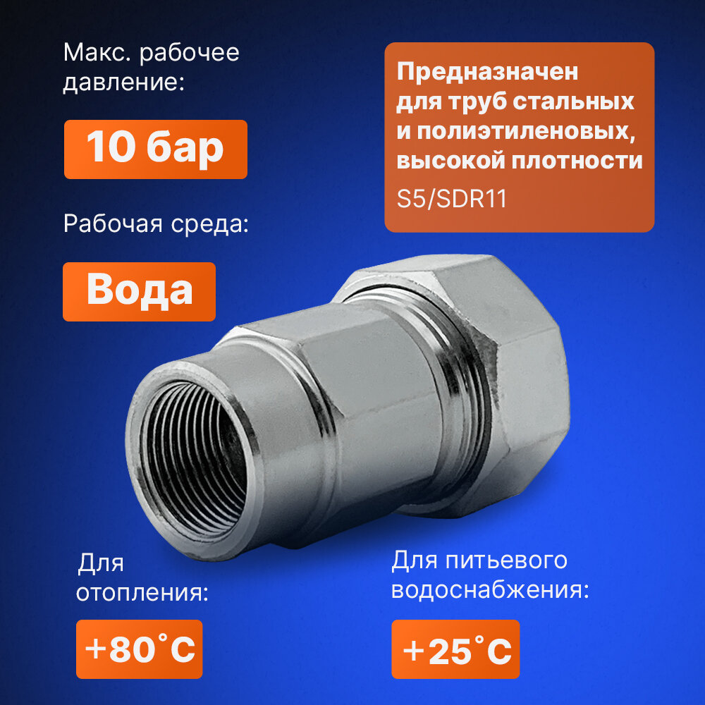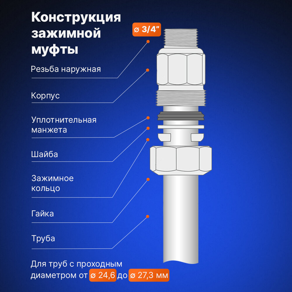 Муфта предназначена для перехода стандартных труб с наружным диаметром от 24,3 до 27,5 мм на резьбу 3/4" дюйма.