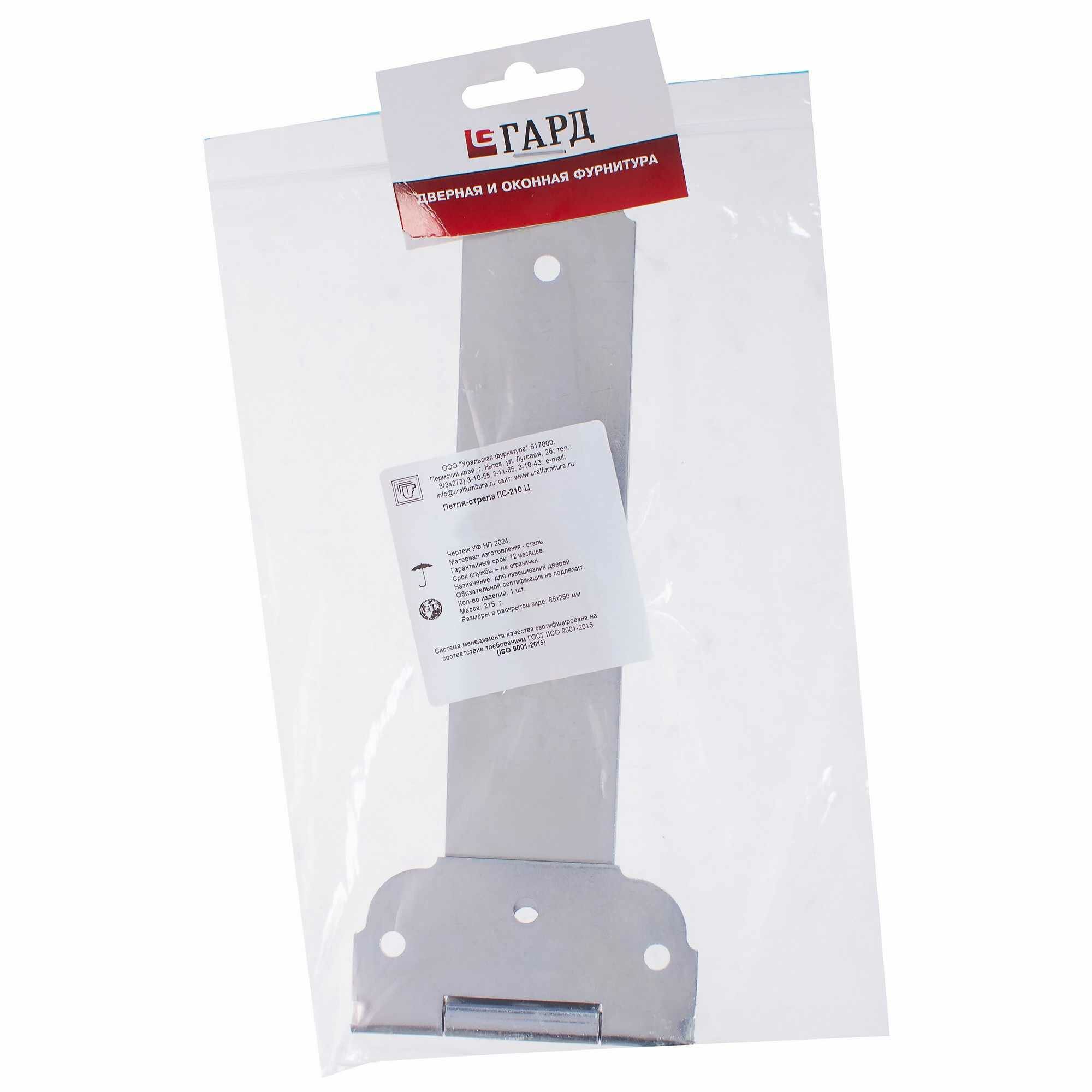 Петля-стрелка УФ ПС-210 — фурнитура для дверей и ворот с полотнами из любых материалов. Стрела не только обеспечивает функциональность, но и придает декоративный вид. Ее используют для полотен большой ширины или в целях поддержания стиля. Петля изготовлена из стали.