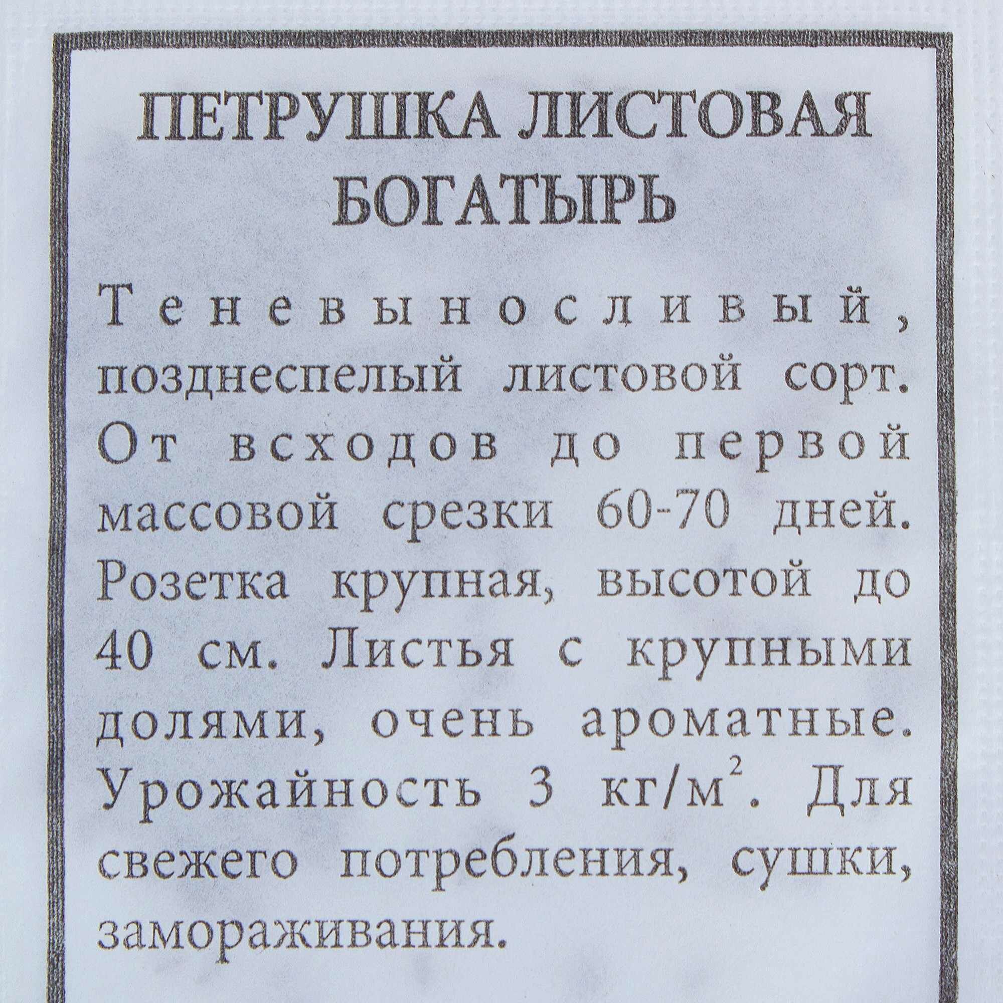 Петрушка листовая «Богатырь» — сорт, устойчивый к недостатку солнечного света. На крупной розетке формируются ароматные листья с большими долями. В свежем или сушеном виде они станут достойной приправой ко многим блюдам. Для долгого хранения зелень можно заморозить. Петрушка используется в ряде медицинских рецептов.