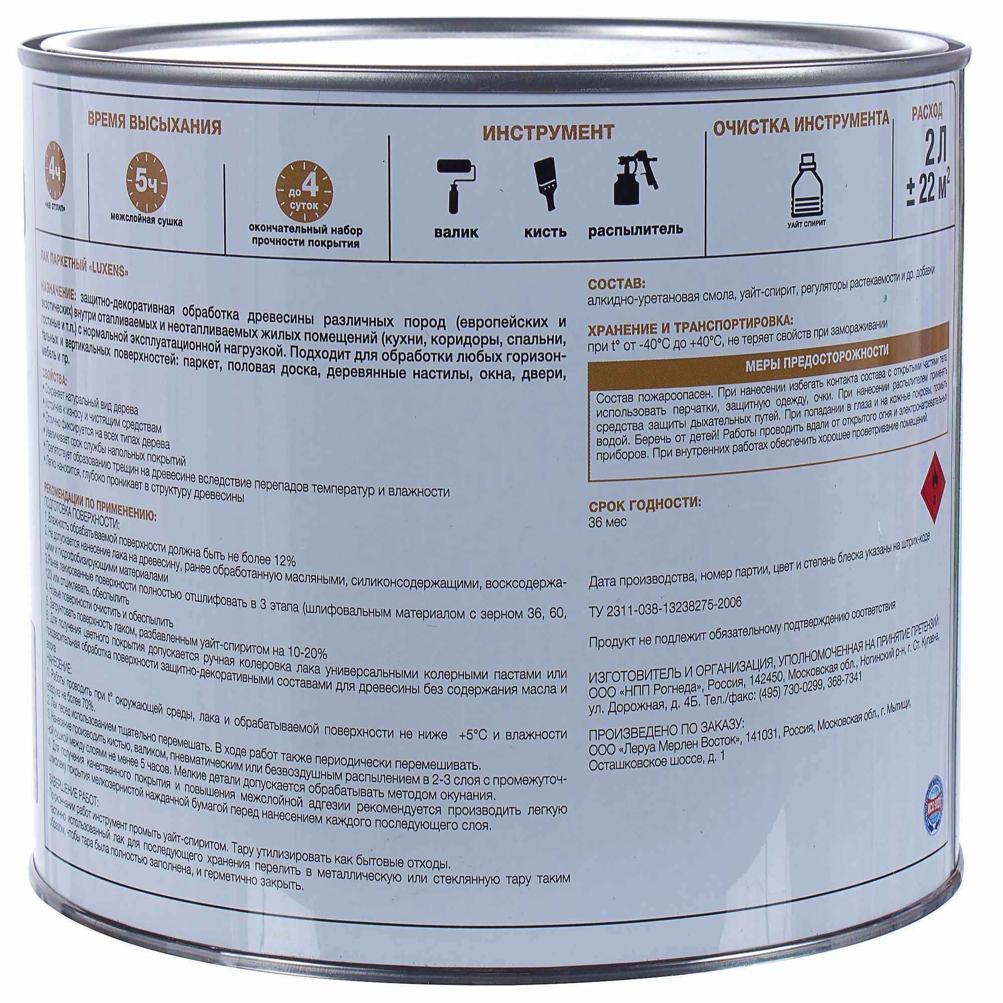 Лак паркетный повышенной прочности Luxens моющийся — состав, используемый для обработки поверхностей из древесины европейских и экзотических пород. Подходит для покрытия паркета и половых досок, деревянного настила, окон и дверей, корпусной мебели. Лак предназначен для внутренних работ в отапливаемых и неотапливаемых помещениях квартир и домов. Подходит для всех типов древесины. Лак создает защитный слой и выполняет декоративную функцию.