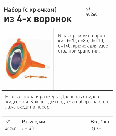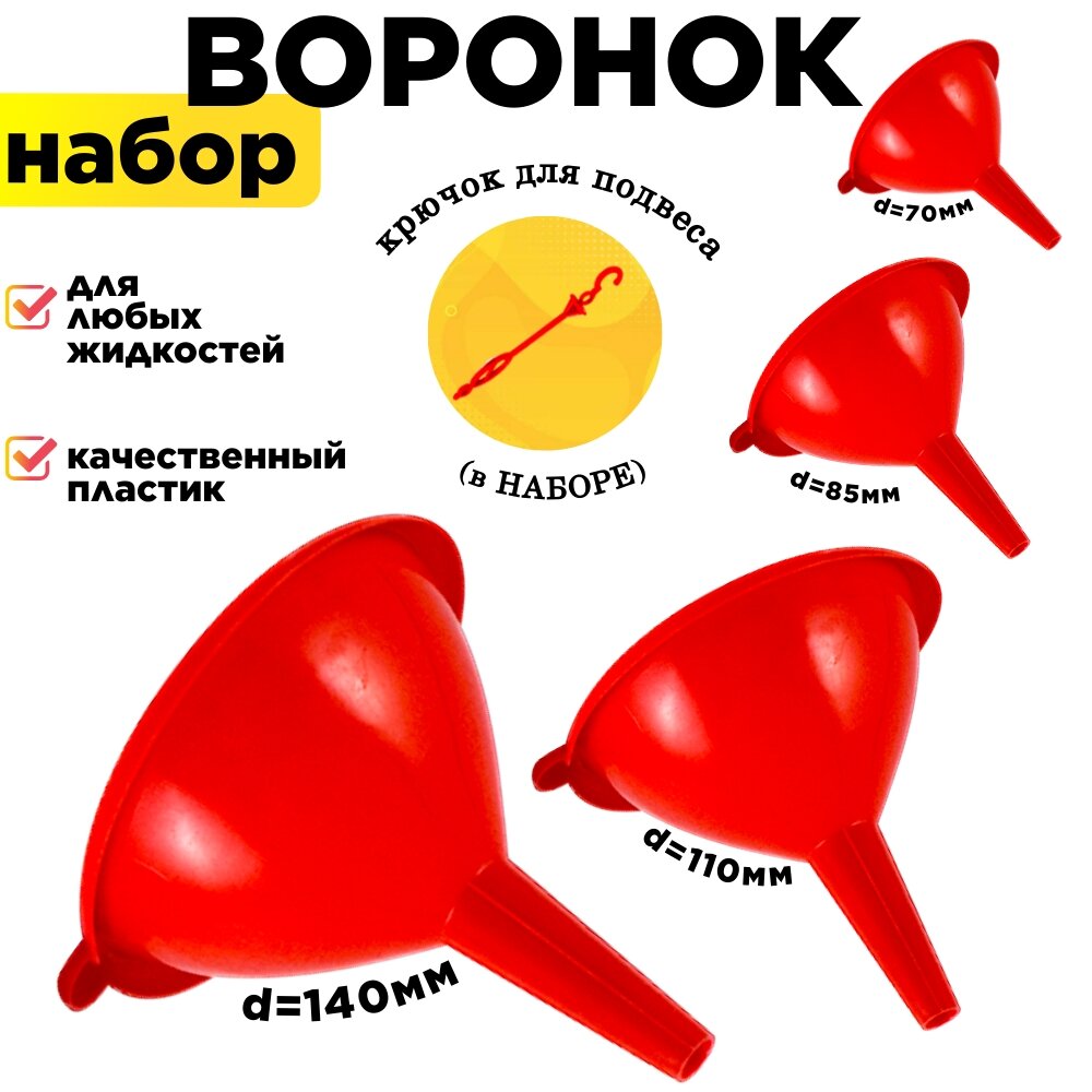 **Набор воронок** состоит из 4 предметов разного диаметра и пропускной способности. Каждый элемент предназначен для переливания продуктовых, строительных, автомобильных жидкостей. Воронки оборудованы кольцами для удобства подвешивания на крючок.