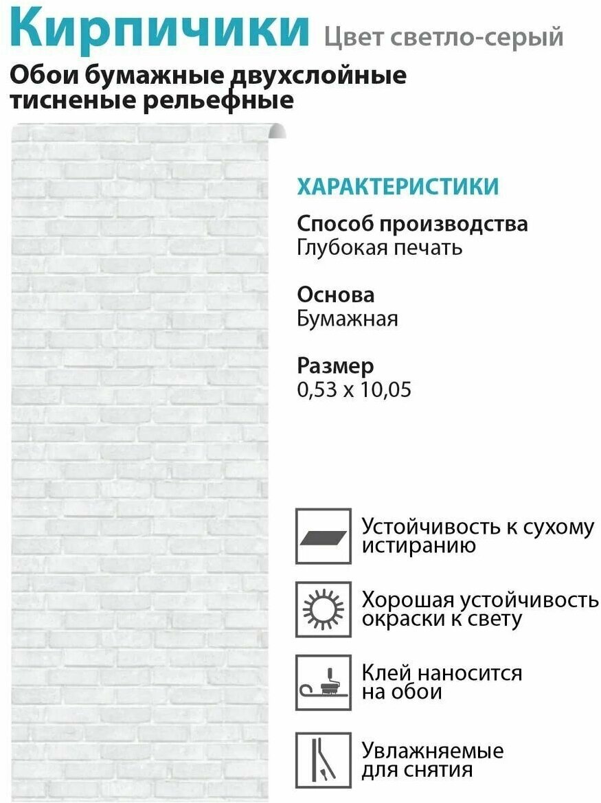 Обратите внимание на номер партии обоев: рулоны из разных партий могут различаться оттенком. Если партии не хватает на все стены, оклейте каждую стену одной партией. Обои бумажные гофрированные «Кирпичики» обладают особой фактурой: их поверхность покрыта миниатюрными фигурными складками, которые не только необычно выглядят в интерьере, но и маскируют небольшие неровности стен. Бумажные обои экологичные, «дышащие», подходят для жилых комнат — гостиных, спален, домашних кабинетов. Длина рулона — 10 м, ширина — 0,53 м.