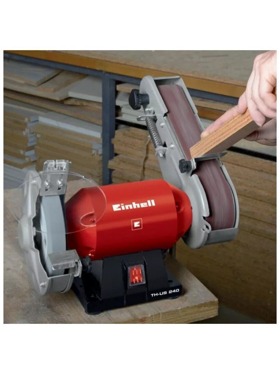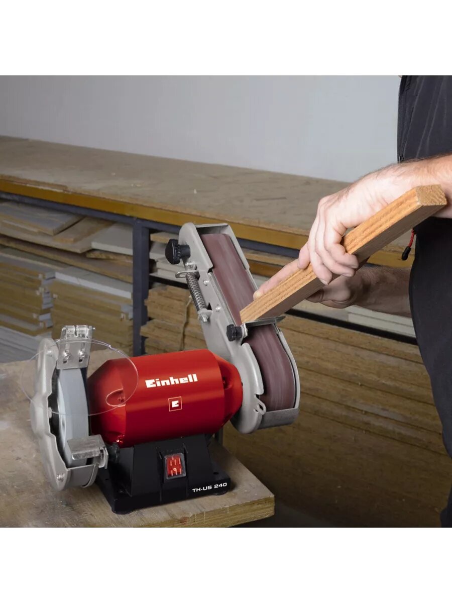 **Станок точильный Einhell TH-US 240 (4466150)** служит для шлифовки деталей из мягкого металла и дерева. Корпус модели выполнен из прочного высококачественного материала, который надежно защищает внутренние элементы от повреждений. Четыре резиновые ножки обеспечивают устойчивость конструкции, а также способствуют равномерному распределению вибраций. Различная зернистость ленты и круга открывает широкие возможности эксплуатации, а также гарантирует превосходную точность отделки. ### Особенности: - Закрытые кожухи шлифовальных кругов для безопасной работы; - Грубый шлифовальный круг в комплекте; - Регулируемый щиток от искр для безопасной работы; - Шлифовальная лента в комплекте; - Регулируемые суппорты для более гибкой работы; - Прочный металлический корпус; - 4 опоры из резины для устойчивости.