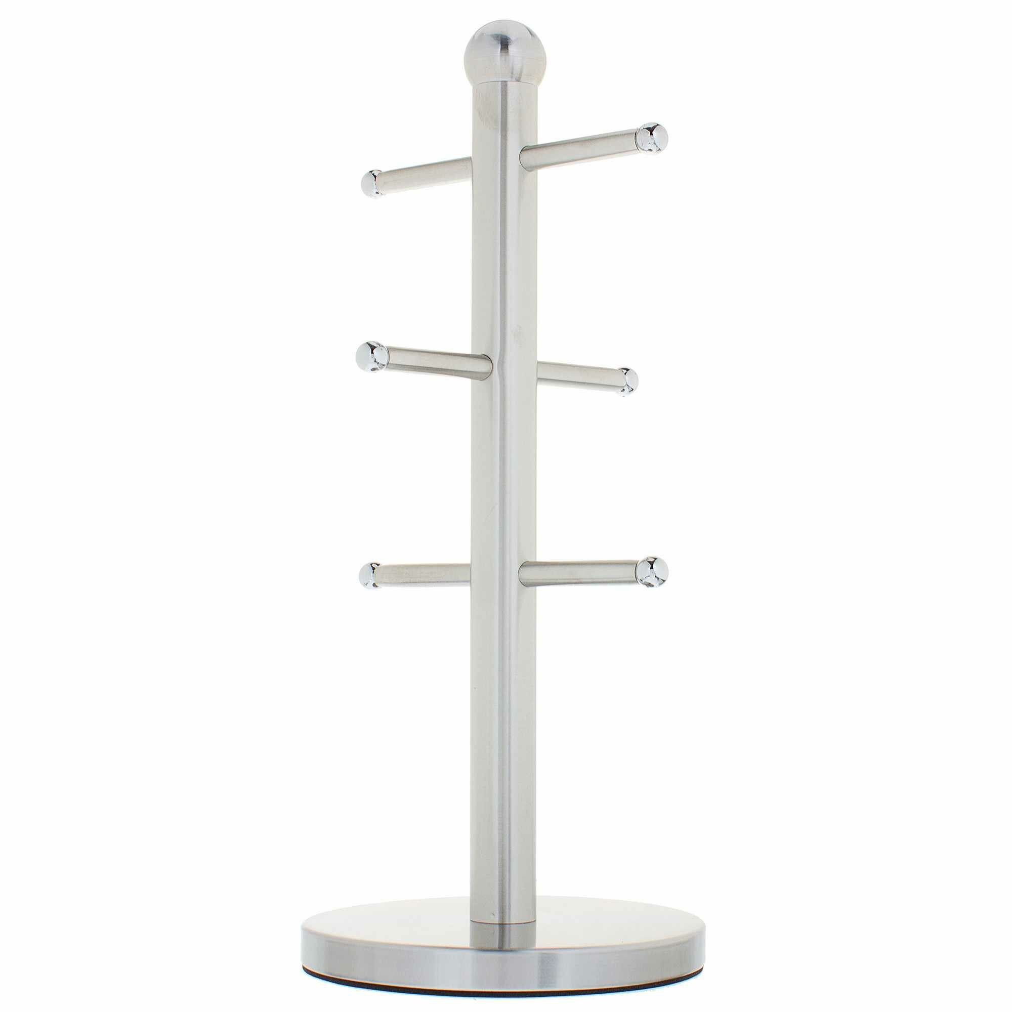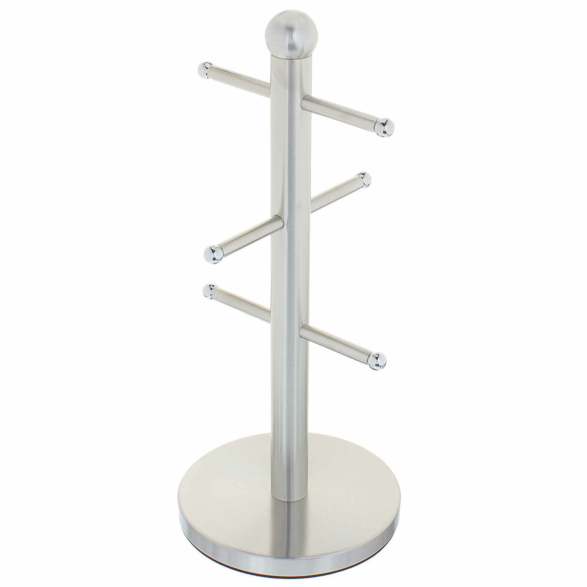 Держатель чашек NEO — настольный аксессуар для кухни, с помощью которого интерьер приобретает стильный и опрятный вид. Изготовлен из нержавеющей стали с матовым покрытием цвета «хром». Размер стойки — 15×35,5 см. На держателе можно разместить до 6 чашек: они подвешиваются за ручки на перекладины. Стойка экономит место и позволяет держать посуду под рукой.