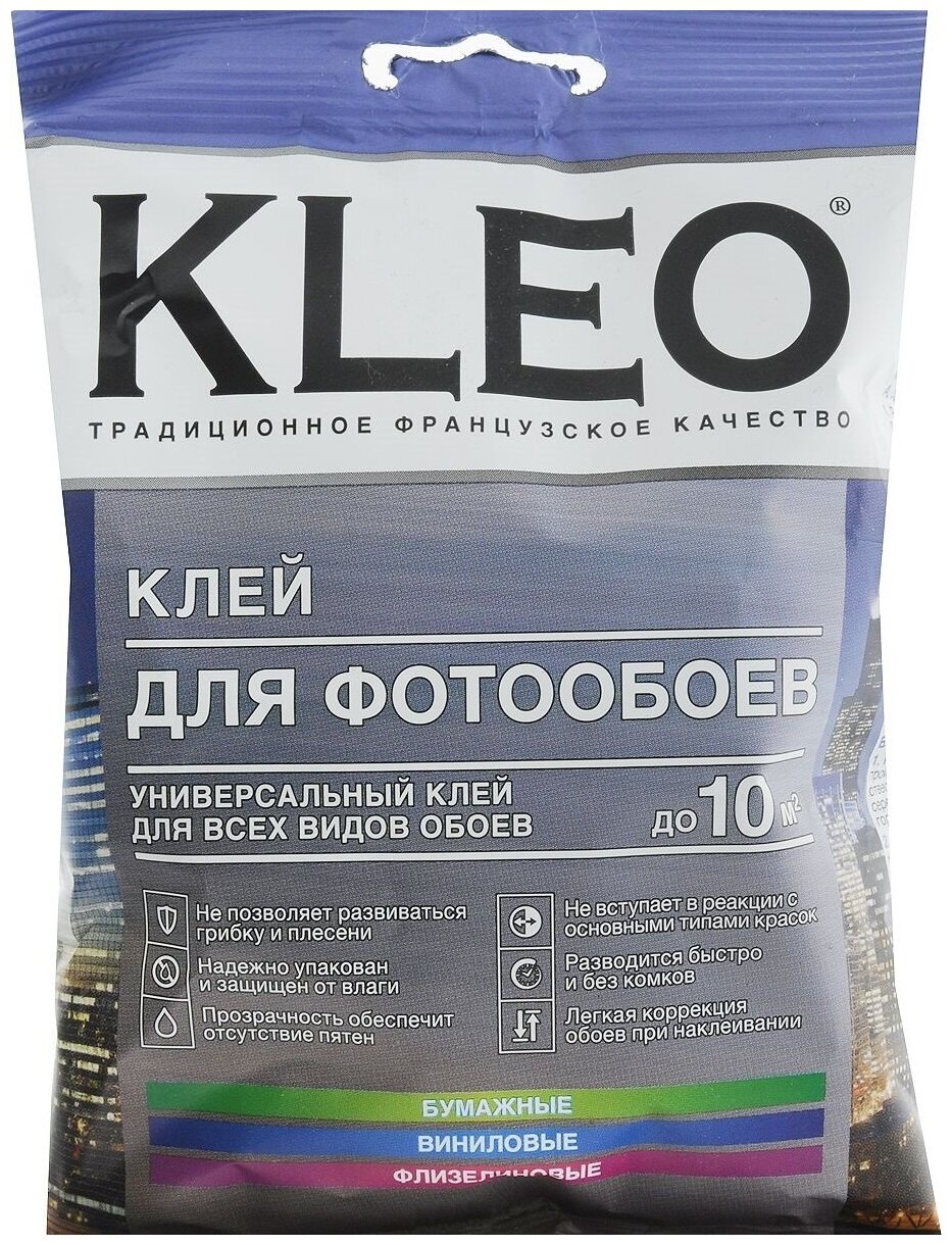 Клей для фотообоев Kleo — сухая строительная смесь с высокими адгезионными свойствами. Используется для приклеивания бумажных, виниловых и флизелиновых фотообоев. Клей отличается экологичным и безопасным составом на основе модифицированного крахмала, который не вступает в реакцию с основными видами красок и не вредит здоровью. Специальные антибактериальные добавки препятствуют появлению плесени под обоями. Гладкая, но клейкая текстура скользит и позволяет легко корректировать положение полотен на стене. Сухая смесь тщательно упакована, быстро разводится без комков, а после высыхания не меняет цвет и не оставляет пятен. Расход одной упаковки — 10 м^2^.
