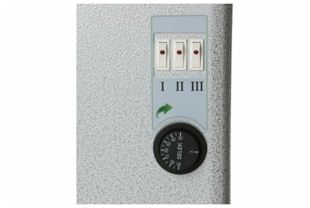 На лицевой панели котла расположены клавиши переключения мощности 4,5 (1,5/1,5/1,5) кВт и регулятор температуры до 85 °С.