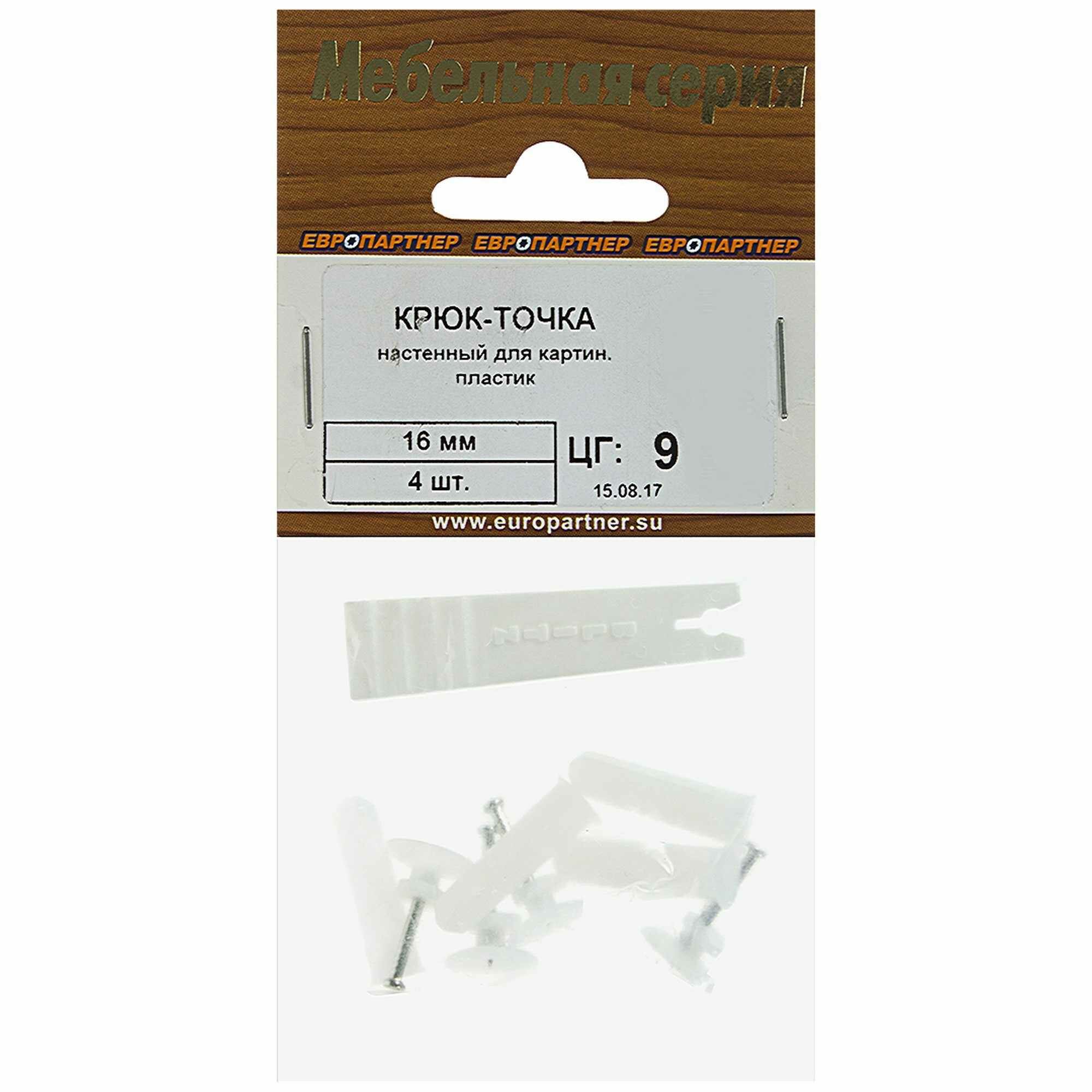 Крюк-точка настенный для картин — это специальное приспособление для быстрого одиночного подвешивания на стену картин и фото в рамках, имеющих небольшой вес. Основным элементом является небольшой пластиковый круг с маленьким выступом для подвешивания и шурупом из прочного металла посередине. Крюк-точка используется для подвешивания на нить или тонкую веревку. В одной упаковке содержится 4 крюка-точки, а также комплект для монтажа. Диаметр изделия — 16 мм.