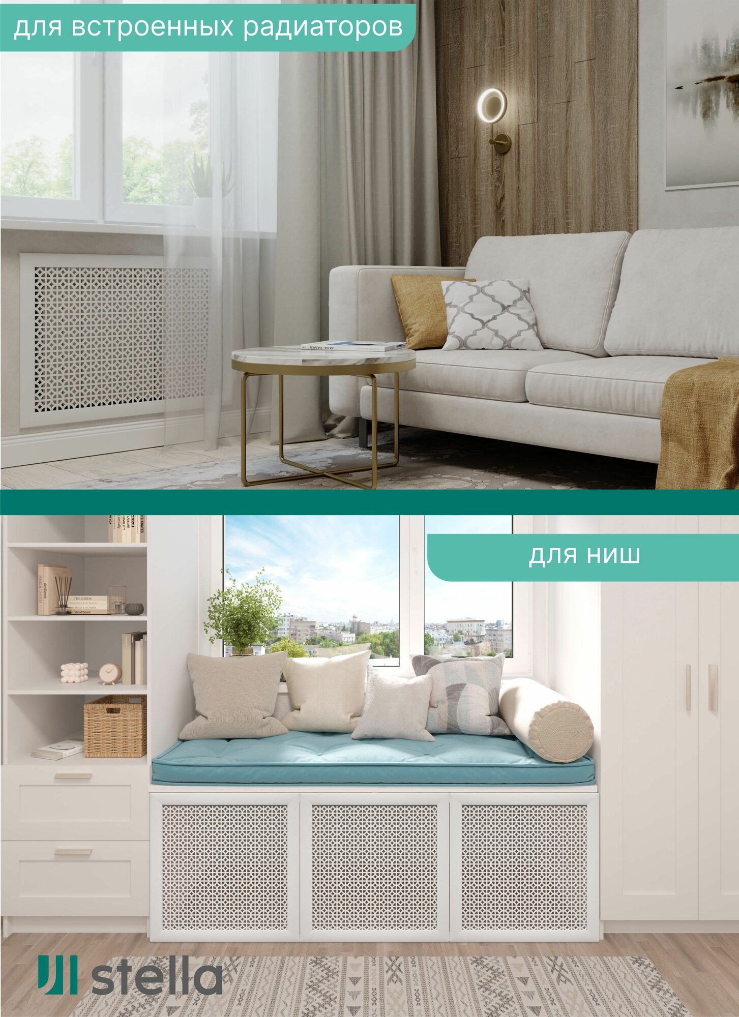 Экран для радиатора «Сусанна» размером 60х60 см представляет собой декоративную панель, которая призвана облагородить внешний вид батареи отопления. Такая конструкция подходит для использования с различными видами радиаторов: чугунными, алюминиевыми, биметаллическими.