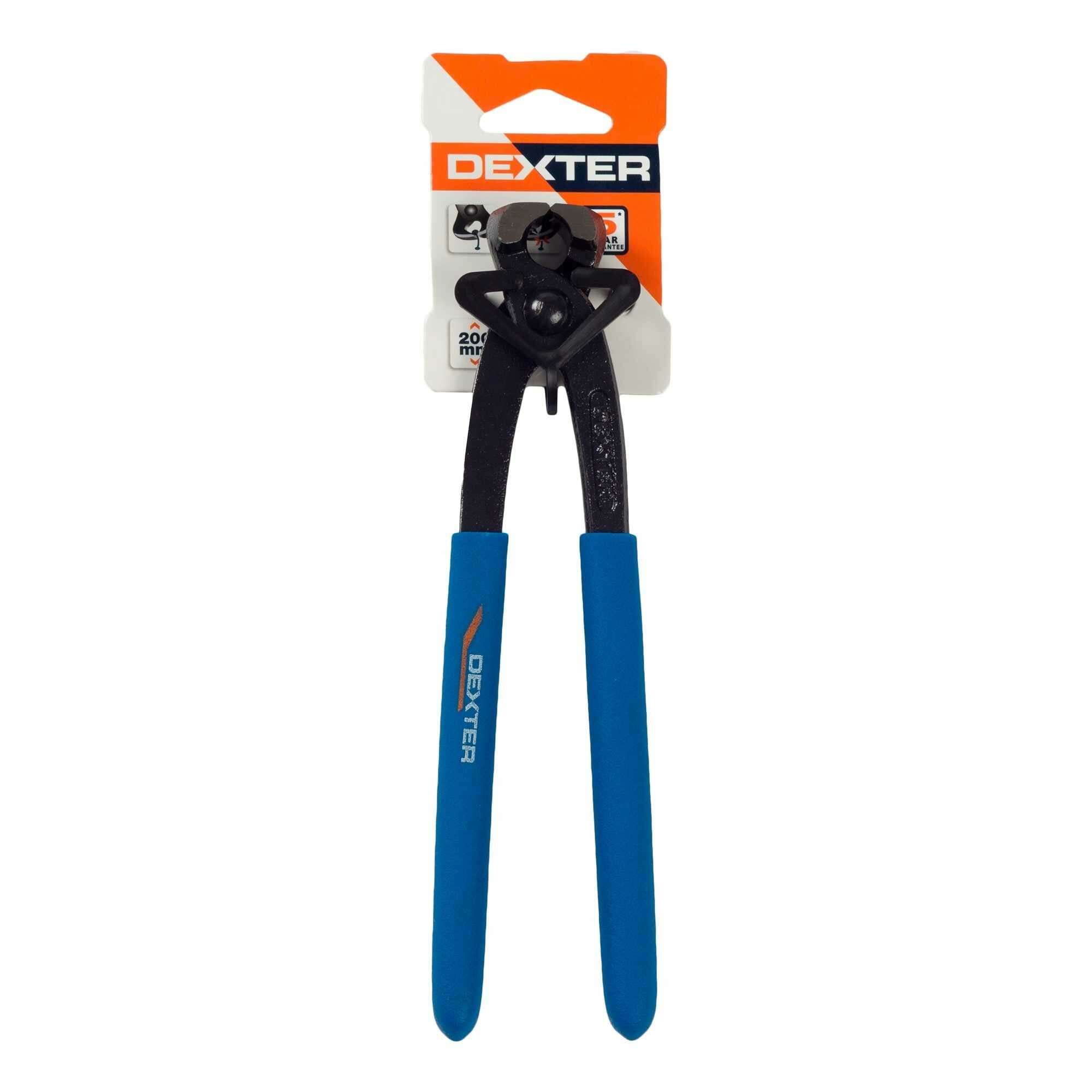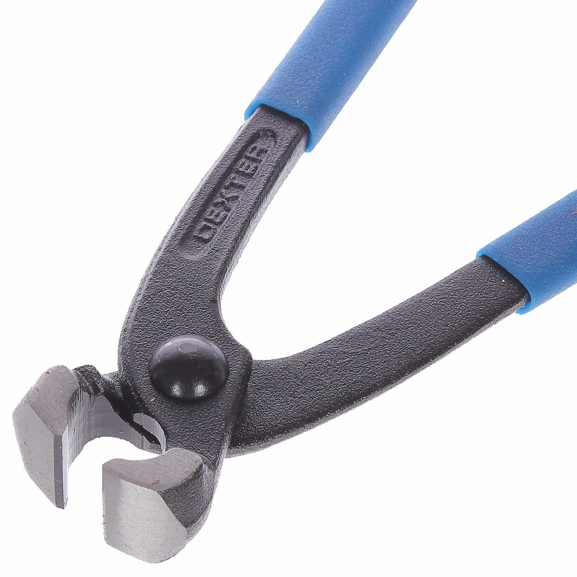 Клещи столярные Dexter — ручной шарнирно-губцевый инструмент для резки, работы с кабелями и проволокой, захвата и извлечения деталей. Клещи изготовлены из прочной хромованадиевой стали, устойчивой к коррозии (твердость по шкале Роквелла 42 HRC). Рабочая часть клещей представляет собой поперечные губки, которые смыкаются заостренными поверхностями. Рукоятки из пластика соединены при помощи шарнирного механизма, позволяют регулировать ширину зева. Длина зажима — 20 см.