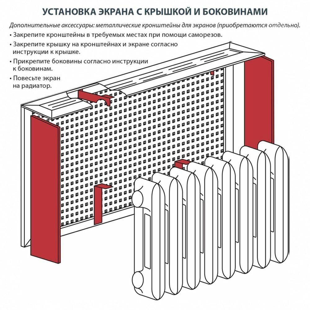 Боковины для экрана ― составные части декоративного короба, используемые для оформления радиаторов в помещении. Главное преимущество отдельных боковин заключается в возможности самостоятельно подобрать фасад экрана, который будет гармонировать с интерьером. Внешняя высота деталей — 60 см, внешняя глубина — 1,6 см. Материал изготовления — ламинированная ДСП.