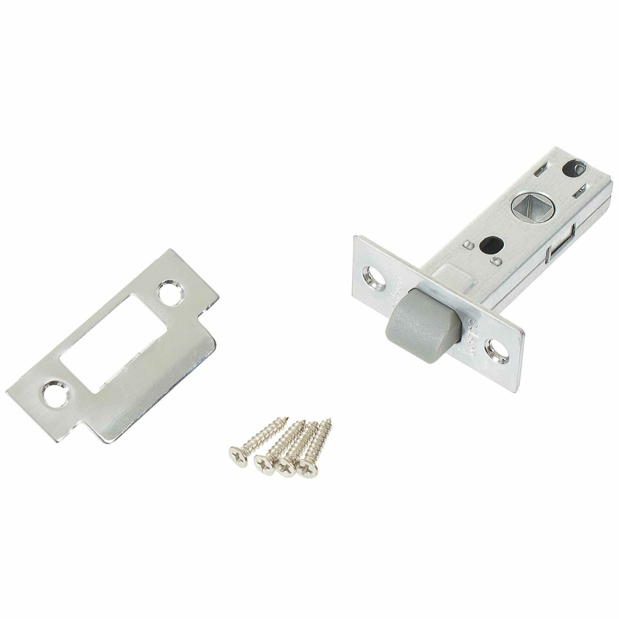 Корпус защелки выполнен из стали, язычок — из пластика, что обеспечивает бесшумное открывание и закрывание двери. Длина детали 8 см, ширина — 6 см, высота — 2,5 мм. Цвет фурнитуры — «хром». Защёлка применяется совместно с фалевыми ручками (подбираются отдельно). В комплект входят: