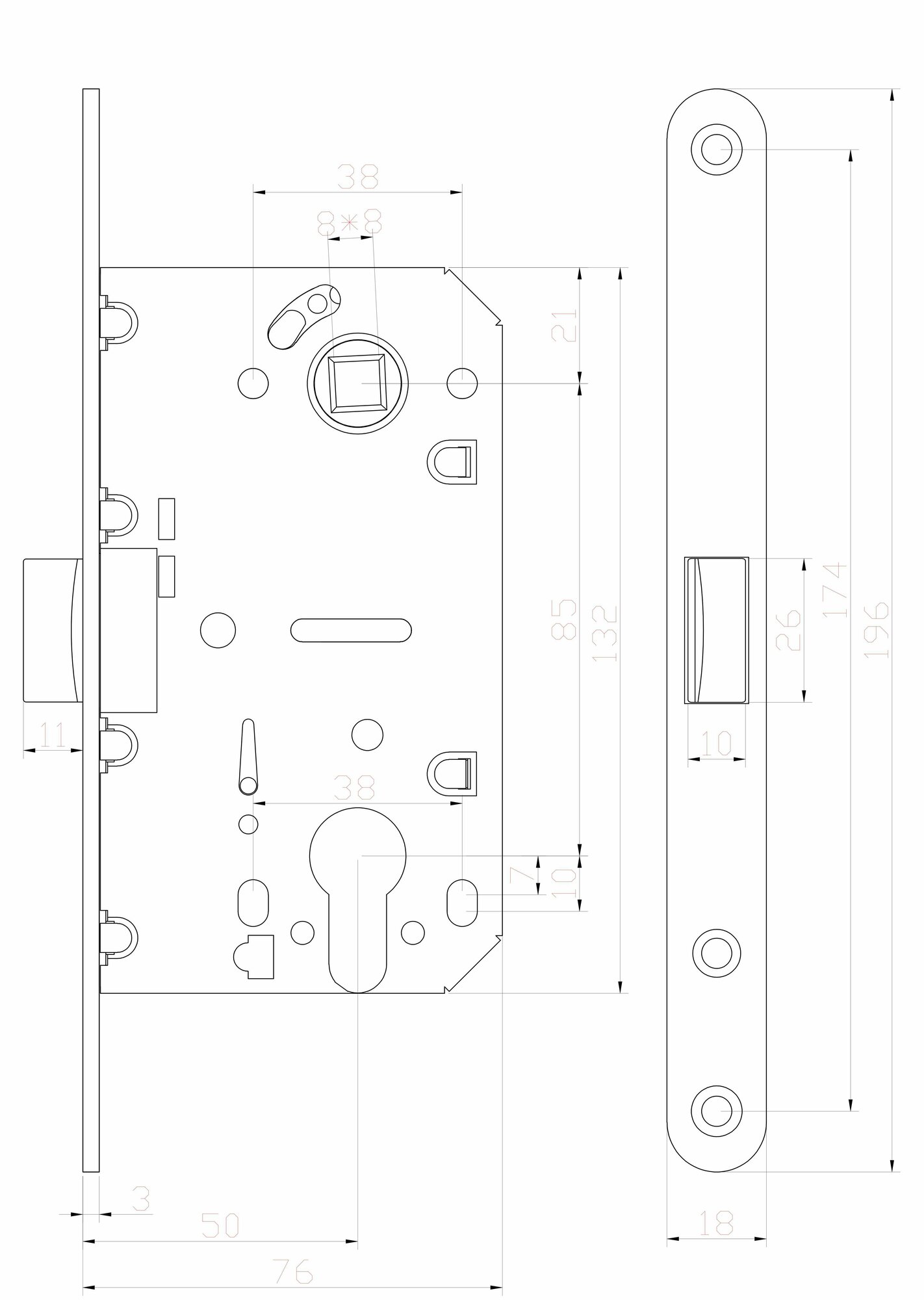Корпус изделия изготовлен из стали, язычок — из пластика (защелкивается практически бесшумно). Цвет фурнитуры — «медь». Габариты детали 75х200х20 мм. Фиксация изделия в дверном полотне производится на саморезы. Расстояние между посадочными отверстиями составляет 85 мм. Конструкция предусматривает установку цилиндрического замка под ключ на две стороны. Защёлка произведена в Китае. Срок гарантийного обслуживания — 5 лет.