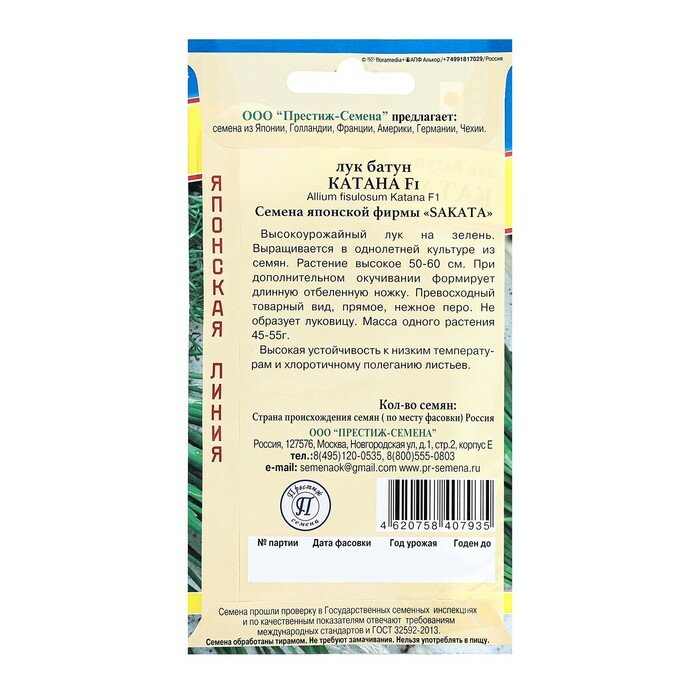 **Семена Лук батун «Катана» F1** — высокоурожайный однолетний сорт. Вырастает до 60 см. Перо прямое, нежное. Не образует луковицы. Вес растения составляет от 45 до 55 г.