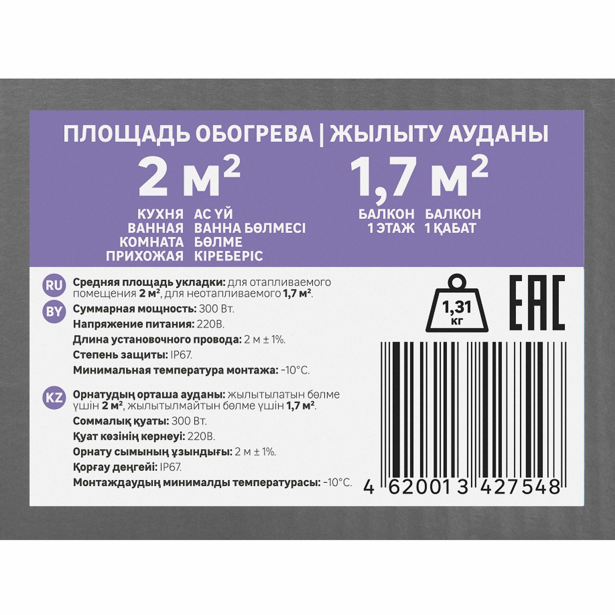 | Состав комплекта | Нагревательная секция, Монтажная лента, Монтажная трубка, Заглушка для монтажной трубки, Паспорт-Инструкция по установке и эксплуатации, Упаковка |