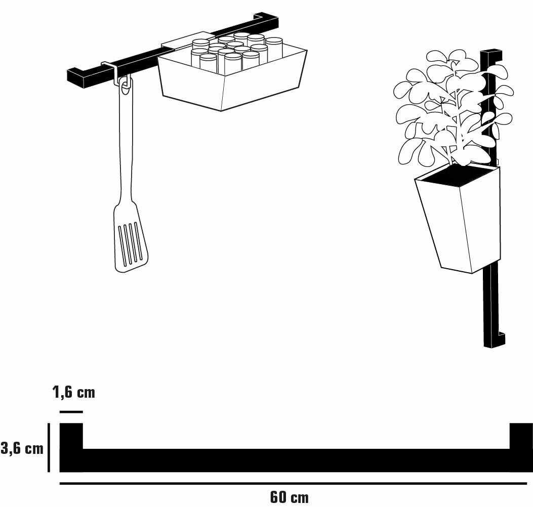 Штанга крепится на стену при помощи винтов. Оптимальное место расположения — под подвесными шкафами в зоне готовки или рядом с мойкой. Кухонные принадлежности размещаются на рейлинге при помощи навесных полок, держателей и крючков.