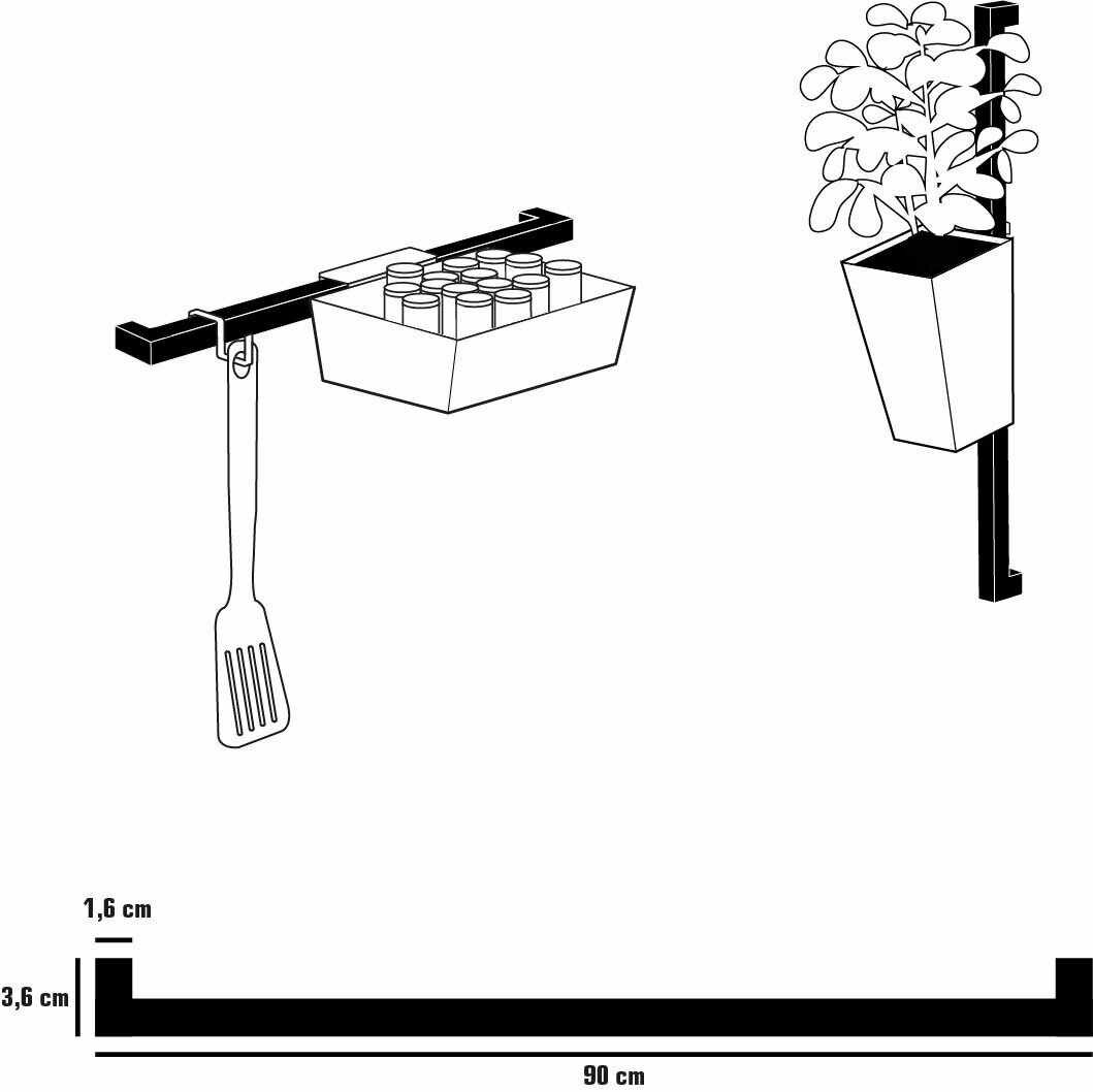 Штанга крепится на стену при помощи винтов. Оптимальное место расположения — под подвесными шкафами в зоне готовки или рядом с мойкой. Кухонные принадлежности размещаются на рейлинге при помощи навесных полок, держателей и крючков.