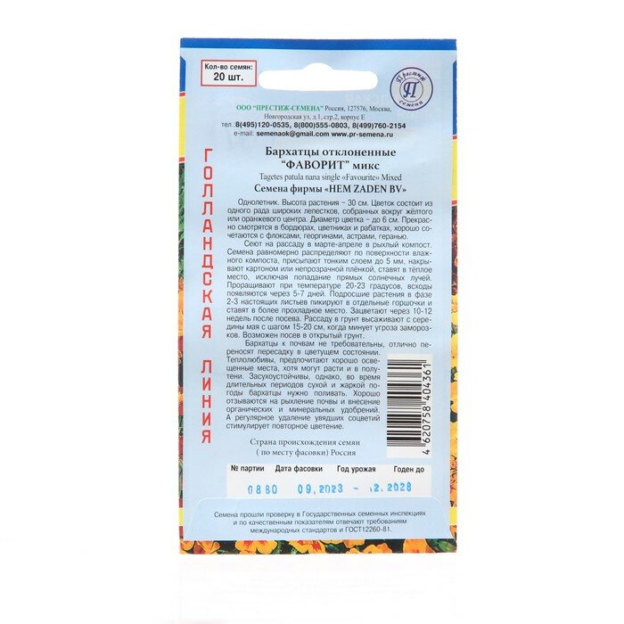 | Сорт | БАРХАТЦЫ ОТКЛ."ФАВОРИТ" СМЕСЬ |