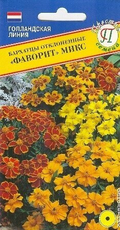Бархатцы отклоненные «Фаворит» — микс невысоких (до 30 см) однолетников с цветами разных оттенков. Цветки простые, с одним рядом широких лепестков и желтой или оранжевой сердцевиной. Диаметр соцветия 6 см. Растение тепло- и светолюбивое, нетребовательно к почвам, цветет дружно. При удалении сухих цветов быстро завязывает новые. Посев на рассаду производят в марте-апреле, в открытый грунт переносят в мае.
