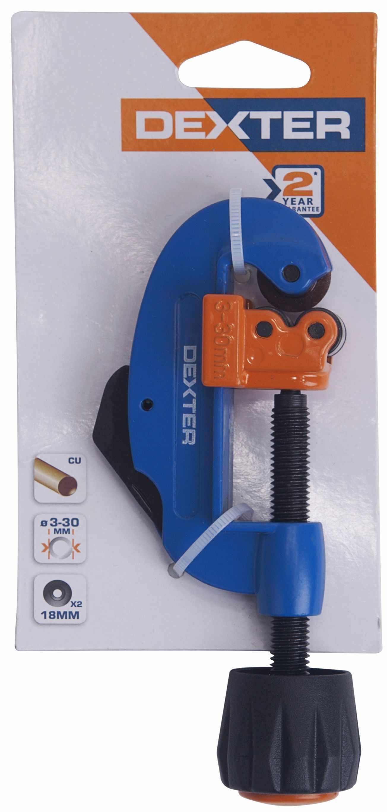 Резак для металлических труб Dexter — ручной труборез для медных труб диаметром от 3 до 30 мм. Применяется при монтаже водопроводной и отопительной системы. Инструмент состоит из резака, роликов, рукоятки и гратоснимателя. Сила прижима и расстояние между роликами и резаком регулируются с помощью вращающейся рукоятки. Труборез позволяет получить ровный срез без борозд.