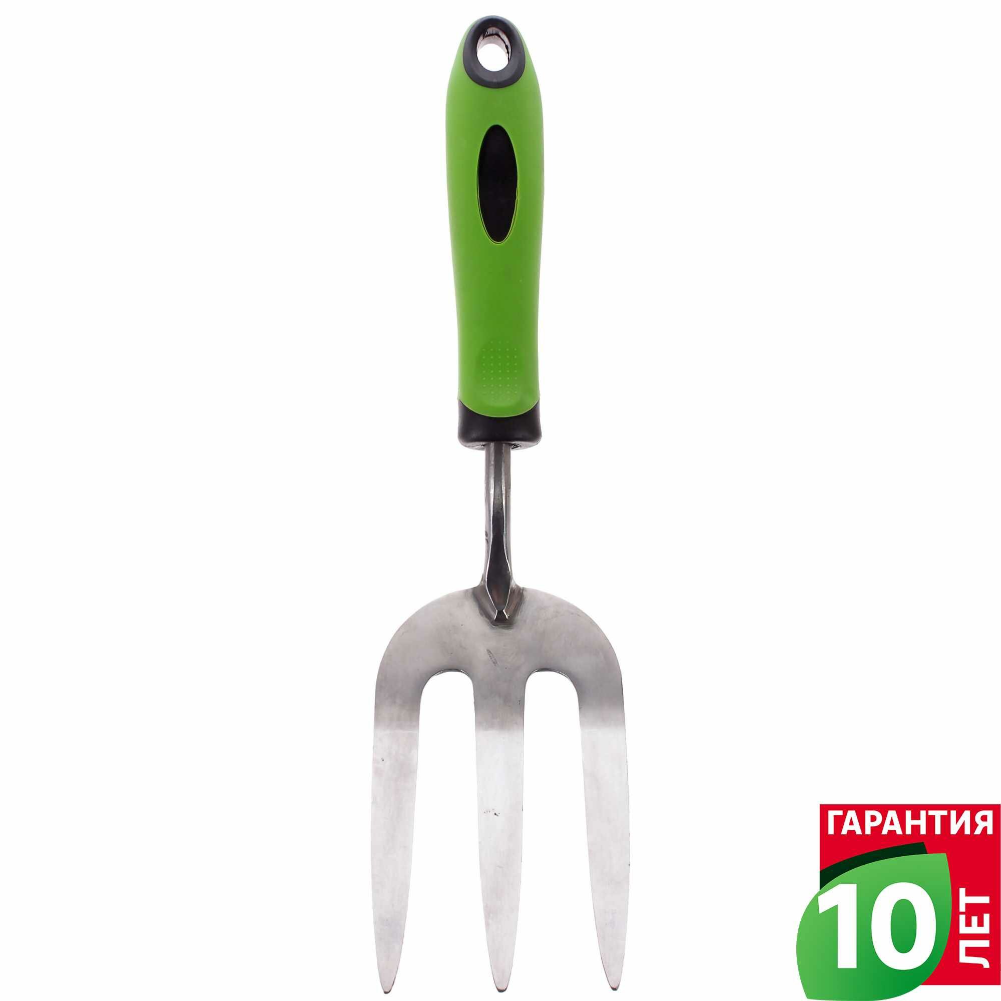 Общая длина изделия 32,2 см, ширина рабочей части 9 см. Компактные размеры позволяют применять вилку на небольших площадях и в труднодоступных зонах участка. Пластиковая ручка диаметром 9,2 мм и длиной 14,7 см не выскальзывает из руки, обеспечивает удобство при выполнении работ.