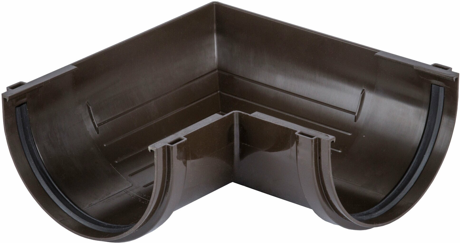 Угол желоба выполнен в каштановом цвете. Подбирается под цвет других частей водостока.