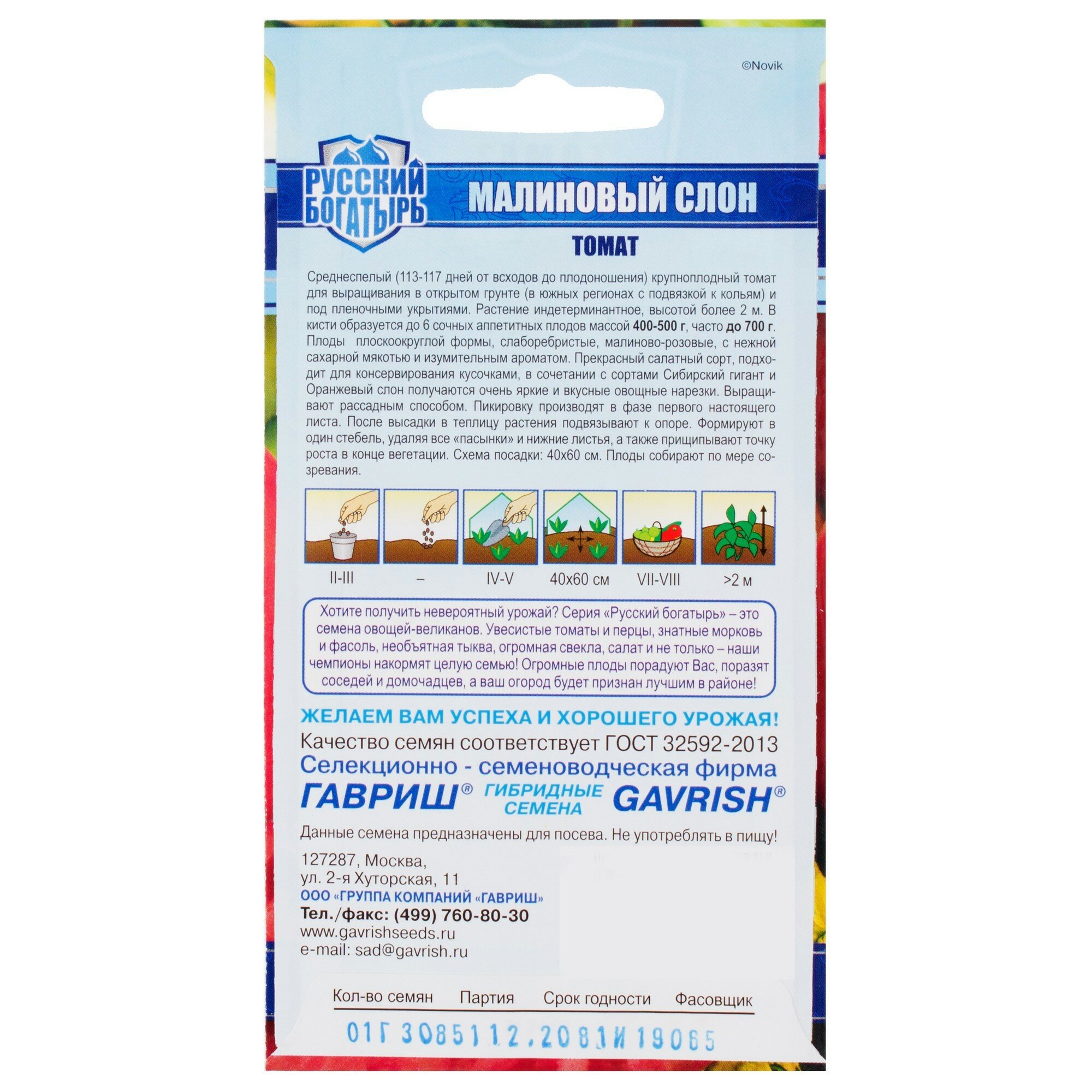 **Семена Томат Малиновый слон** относится к среднеспелым сортам — с момента высева семян до плодоношения проходит от 100 до 110 дней. Может применяться для выращивания в открытом грунте, в теплице. Растение высокорослое, плоды плоскоокруглой формы, мясистые, малиново-розовые.