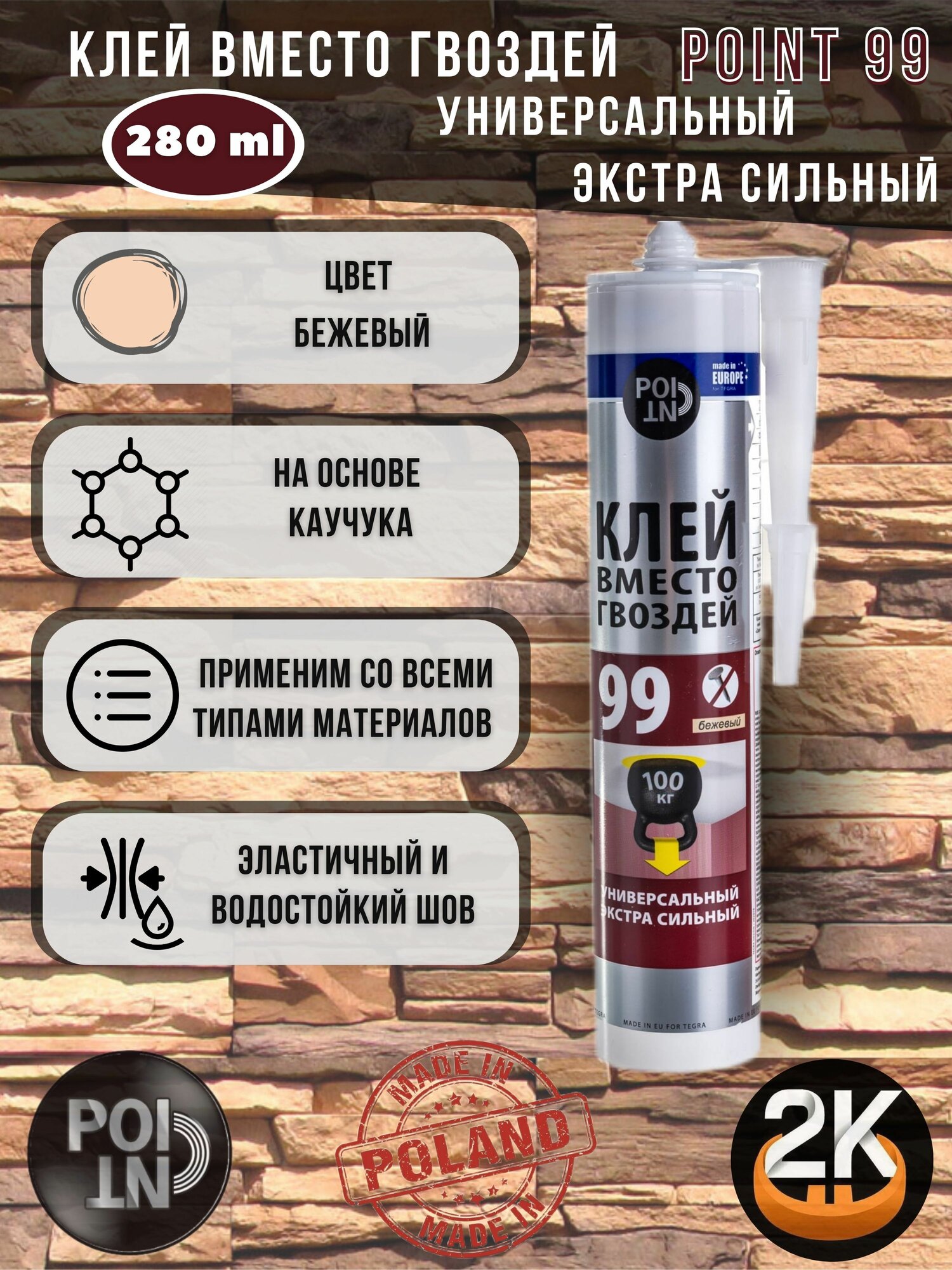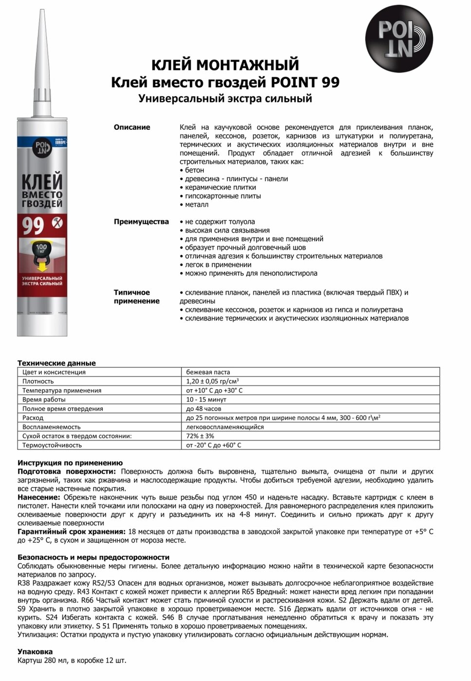 Клей мгновенный всесезонный Point 98 универсальный применяется для монтажных и отделочных работ внутри и снаружи помещения. При нанесении формирует эластичный бесцветный шов, аккуратный и незаметный на материале — важно при декорировании поверхностей. Однокомпонентный состав на базе синтетического каучука (Gummi) схватывается всего за 5-7 минут. После полного отвердевания состав выдерживает температуры в диапазоне от -20 °C до +60 °C.
