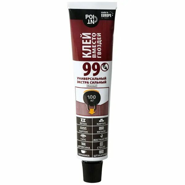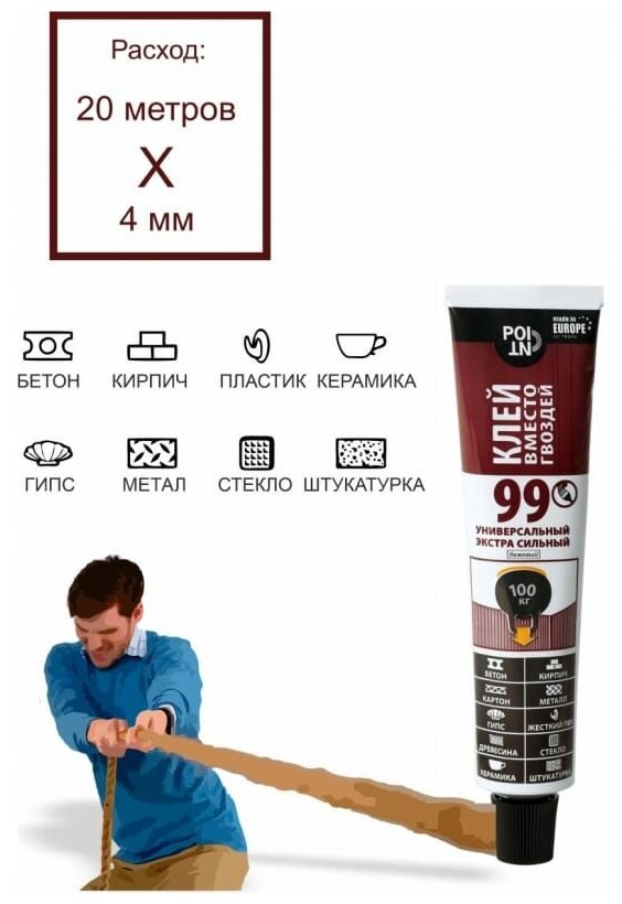 Клей Point 99 Экстра-сильный универсальный используется для монтажа заготовок и отделки различных поверхностей (стен, потолка, деревянных панелей). Тип основания — пористый/впитывающий и блокирующий. Клей подходит для внутреннего и наружного применения, после полного отвердевания диапазон допустимых температур от -20 °C до +60 °C.