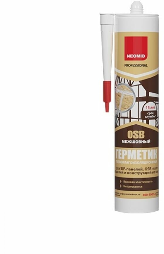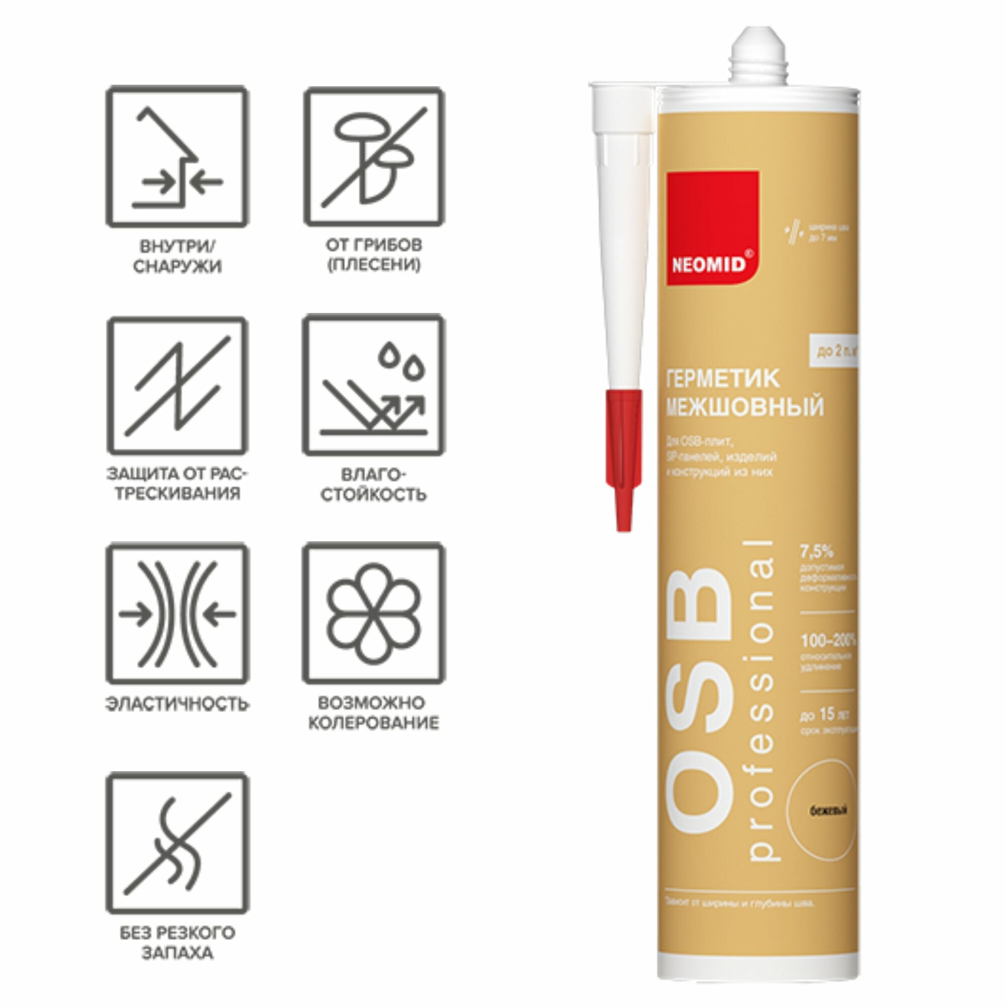 Герметик для OSB-плит и деревянных поверхностей Neomid отличается высокой эластичностью и адгезией. Благодаря этому состав великолепно держится на горизонтальных, вертикальных и наклоненных под любым углом поверхностях.