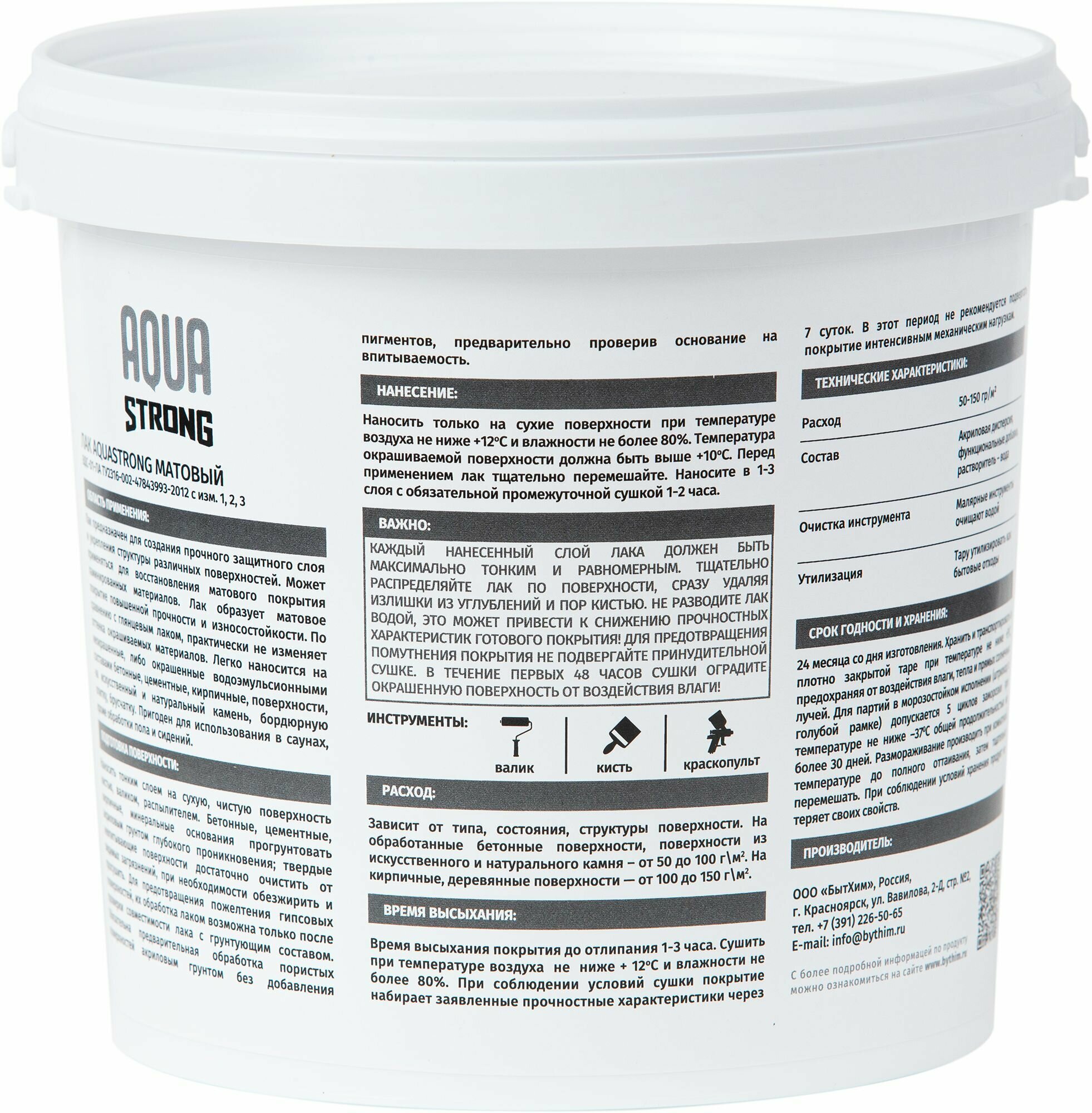 Лак по камню Aquastrong представляет собой состав жидкой консистенции, образующий после высыхания прочный матовый нескользящий слой, защищающий и укрепляющий поверхность. Лак подходит для внутренних и наружных работ, отличается хорошей адгезией с бетоном, деревом, кирпичом, искусственным и натуральным камнем. Используется для покрытия полов, садовых дорожек, фасадов, бордюров и брусчатки, обоев под покраску. Состав наносят на неокрашенную или окрашенную водоэмульсионным составом поверхность.