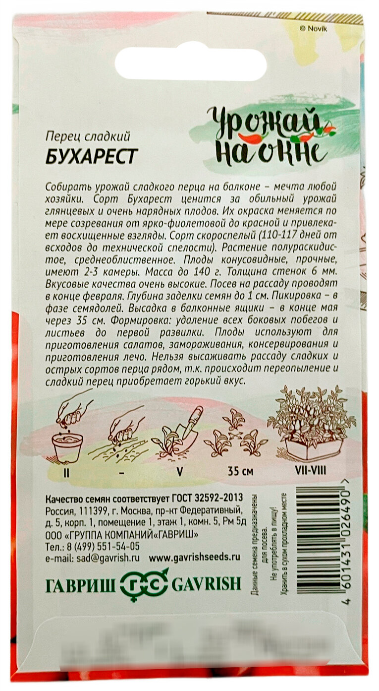 **Семена Перец «Бухарест» Урожай на окне** — скороспелый сорт, первый урожай которого собирают спустя 110-117 суток, начиная от полных всходов. Подходит для выращивания в открытом и защищенном грунте, теплице. Посев на рассаду проводят в конце февраля. Рекомендуется соблюдать схему рассадки 35 х 35 см.