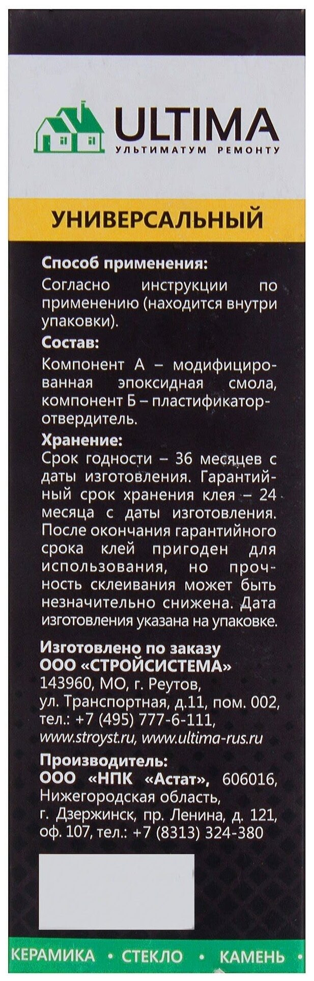 Клей эпоксидный Ultima — двухкомпонентный состав на основе эпоксидной смолы, предназначенный для склеивания или герметизации неразборных соединений, заделывания пор, трещин, раковин при ремонте предметов интерьера, домашнего инвентаря, корпусов бытовой техники. Допускается применение для послойного наращивания поверхностей и восстановления размеров изношенных деталей, элементов крепежа. Вес в упаковке — 140 г. Цвет — прозрачный.