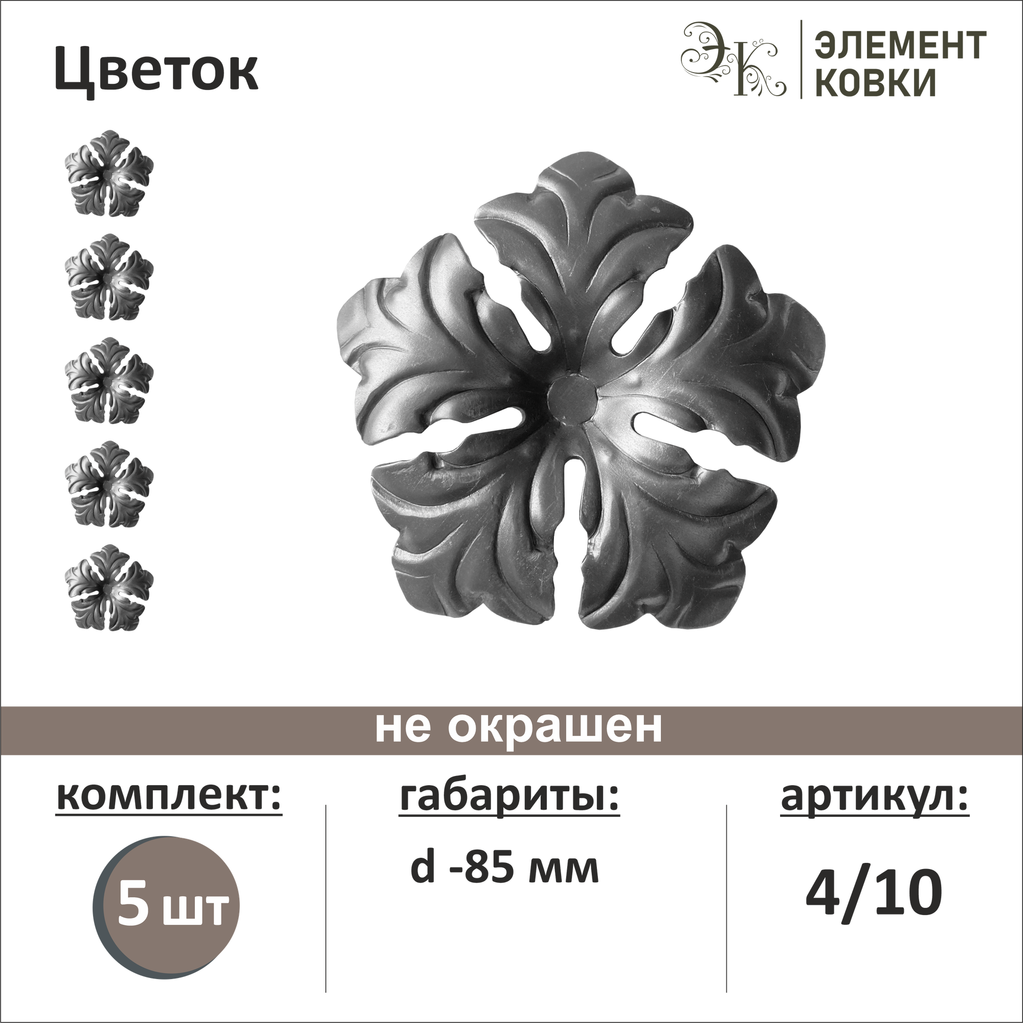 Цветок №2 фигурный подойдет для художественного оформления любых металлических конструкции: лестниц, перил, заборов. Используя этот элемент с естественным рисунком, можно создавать уникальные композиции. Цветок выполнен из прочной стали без покрытия. Тип установки — сварка.